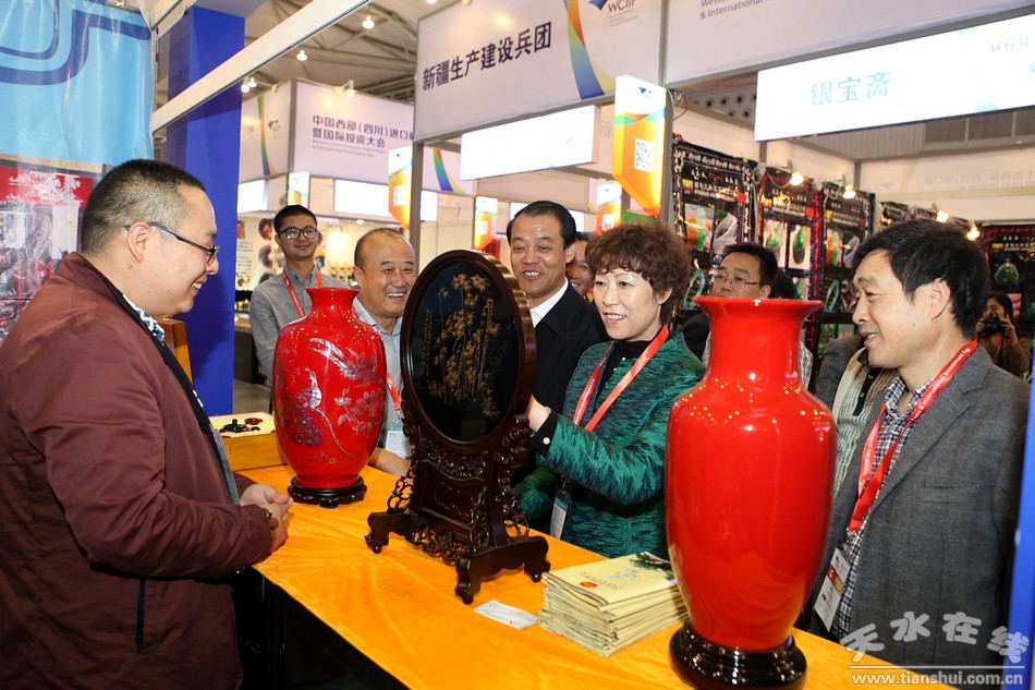 本次展会为了积极融入国家“一带一路”战略,加强中西部地区与长江经济带合作和经贸交流。重点宣传推介天水经济社会发展情况、优势项目和特色产品。相关部门、各县区及相关企业在温利平副市长带领下参展参会。一是筛选我市企业13户,20个大类的产品,160多个品种参加展示展销;二是筛选各类宣传图片进行宣传推介,包括装备制造业、文化旅游业、现代农业和城市建设等内容;三是热情接待前来我市展区参观、咨询、购物、洽谈的客商和群众。特别是,甘谷县陇上农庄农业发展有限公司所带的120箱富士苹果第一天现场销售一空;四是签订各类产品销售协议及贸易合同300万元。现场销售额10万余元。其中:甘肃陇上农庄农业发展有限公司与成都信心科联商贸有限公司达成长期供货合同50万元,与四川达州批发商签订区域总代理年销售50万元;甘谷大漠行麻编鞋业有限公司与四川标王集团达成供货合同80万元;甘肃莹豪集团与云南韵捷玉器文化公司达成达成长期意向性合同50万元;天水天元文化传播有限公司与成都古文化艺术公司达成代销合同50万元;张家川回族自治县万福清真香醋酿造厂与成都清宝斋签订供销合同20万元。