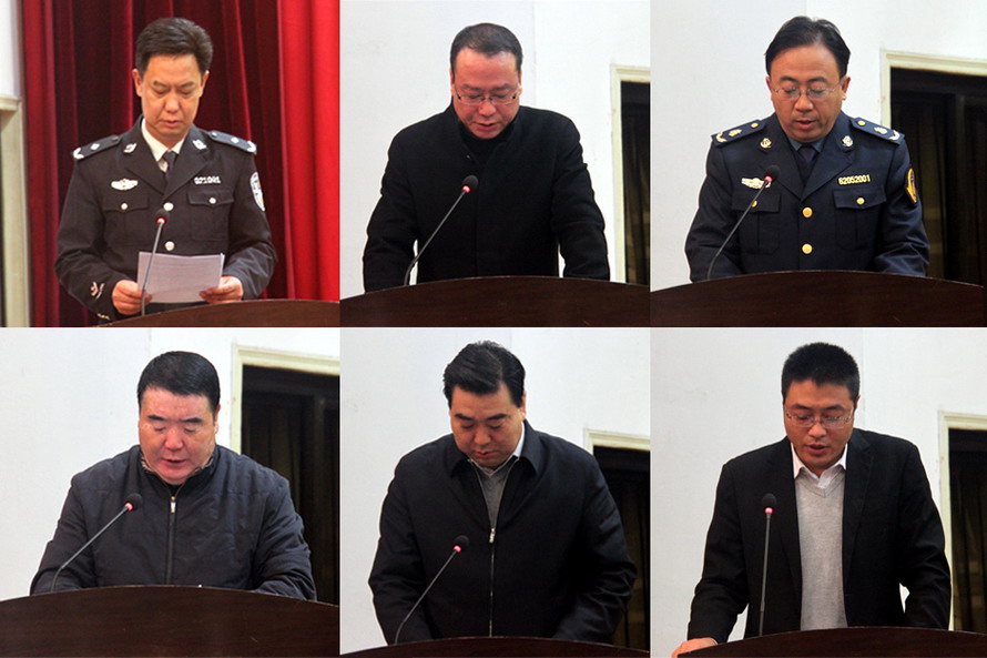 (市公安交警、综合执法、交通运管部门负责人和两区政府分管领导、运输企业代表在会议上作表态发言)