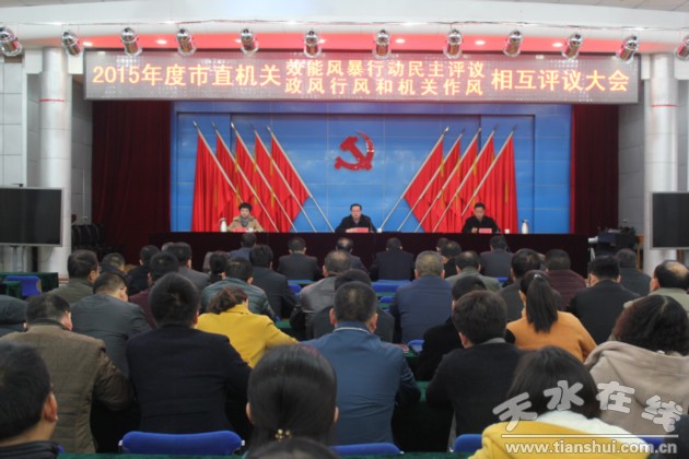 为充分发挥机关党员干部职工的监督作用,进一步加强和改进政风行风和机关作风建设,有力促进民主评议政风行风和机关作风工作扎实有效开展。12月1日,天水市效能办在市委党校大礼堂召开了2015年度市直机关效能风暴行动民主评议政风行风和机关作风相互评议大会。