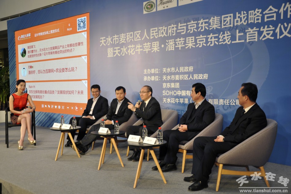 1月5日,甘肃省天水市麦积区人民政府与京东集团在光华路SOHO 3Q 签署战略合作协议。同时,天水花牛苹果集团独家授权京东线上销售潘苹果·花牛9粒装。SOHO中国有限公司董事长潘石屹,天水市副市长霍卫平,京东集团副总裁、京东商城生鲜事业部总裁王笑松等莅临见证。