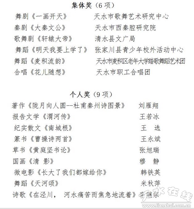 2015年度天水市优秀文艺作品名单