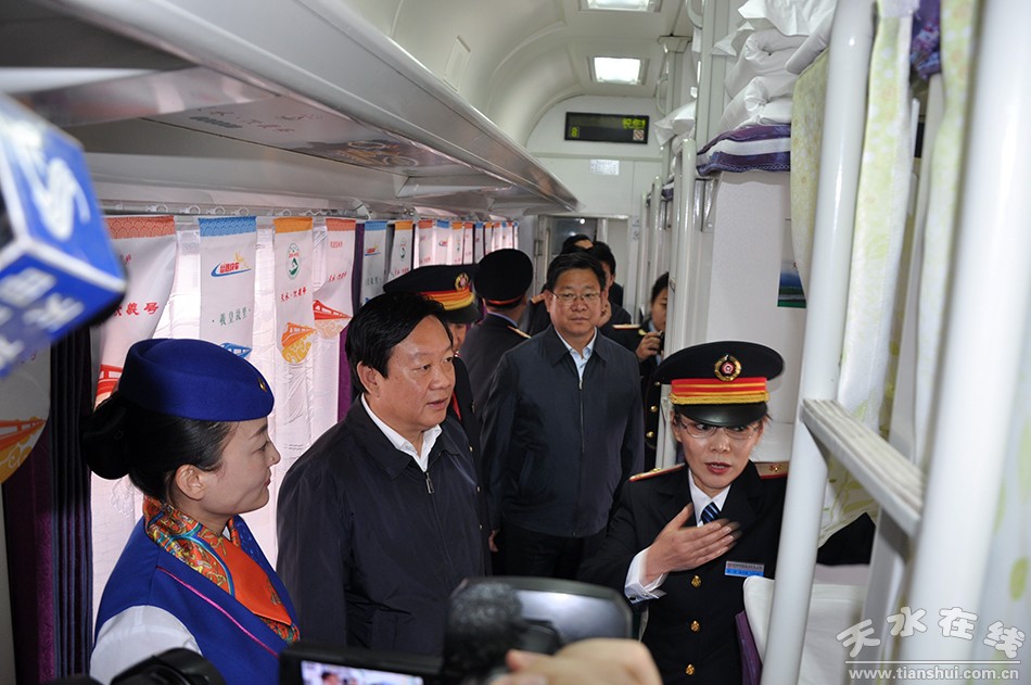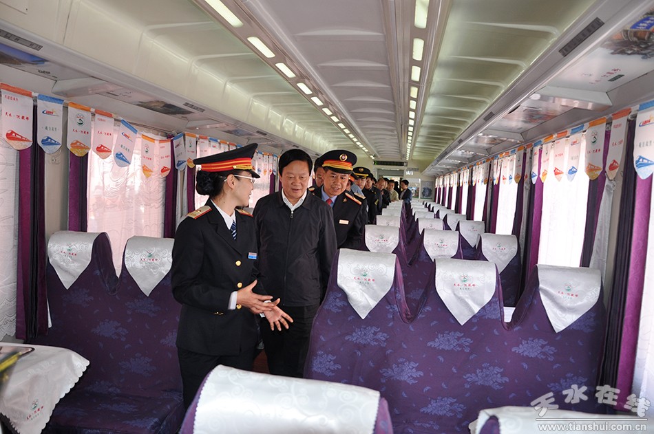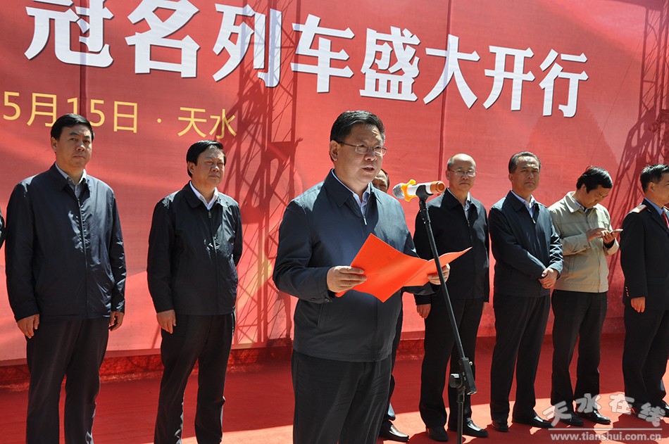 张建杰在首发仪式上讲话。他希望,全市各级各有关部门和旅游行业以此次专列开行为契机,加强旅游市场开拓,加大宣传推介力度,进一步加深与兰州铁路局的合作交流,共同打造丝绸之路铁路旅游新业态。也希望兰州铁路局天水火车站精心组织管理,确保列车安全运营,真正把旅游列车打造成宣传天水、展示天水的窗口,携手共促天水经济社会持续快速发展。