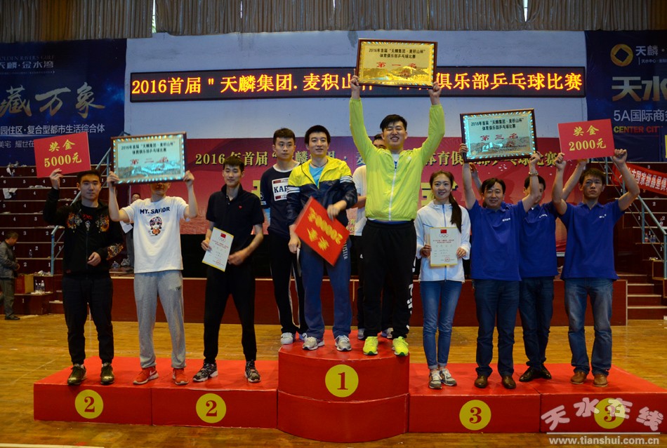 本次比赛由天水市体育局、天水市体育总会主办,天水市青少年体育俱乐部联合会、甘肃天麟房地产开发集团有限公司承办,参赛队员来自北京、湖南、陕西、河北、安徽、甘肃等6个省、市,队员中有部分省市历次比赛获奖选手、现役国家队队员、全国大学生运动会获奖队员,更有前世界奥运会冠军,共组成了44支代表队。通过了三天时间的激烈角逐,甘肃银行天水分行代表队获得第一名,宝鸡市乒乓球协会一队获得第二名,甘肃天麟集团代表队获得第三名,甘肃银行陇南分行代表队获得第四名,天水市诚旺青少年乒乓球俱乐部一队获得第五名,动鸣健身俱乐部天水师范学院三队获得第六名,诚龙体育湖南省乒乓球俱乐部获得第七名,天水市晶星青少年乒乓球俱乐部二队获得第八名。