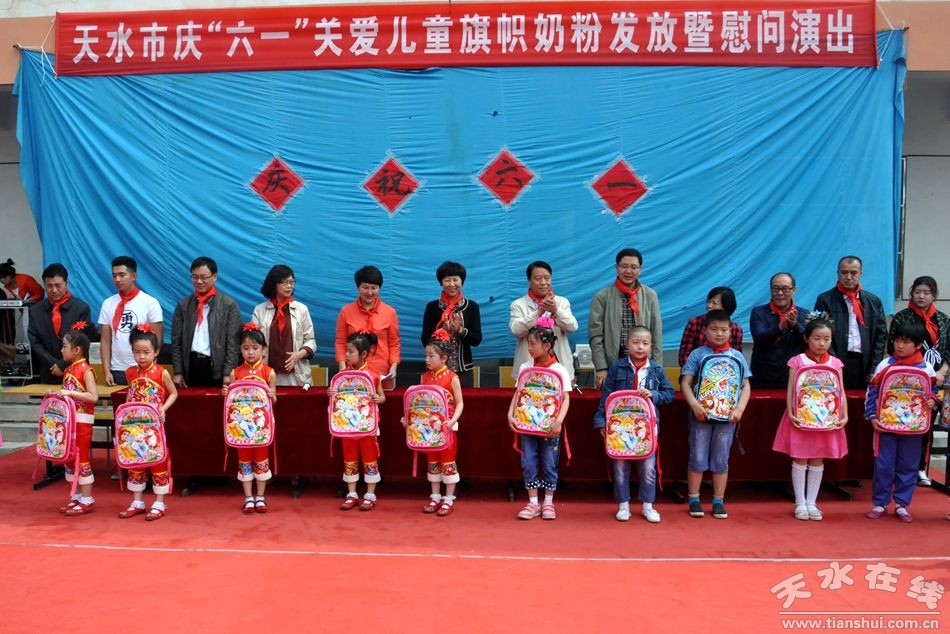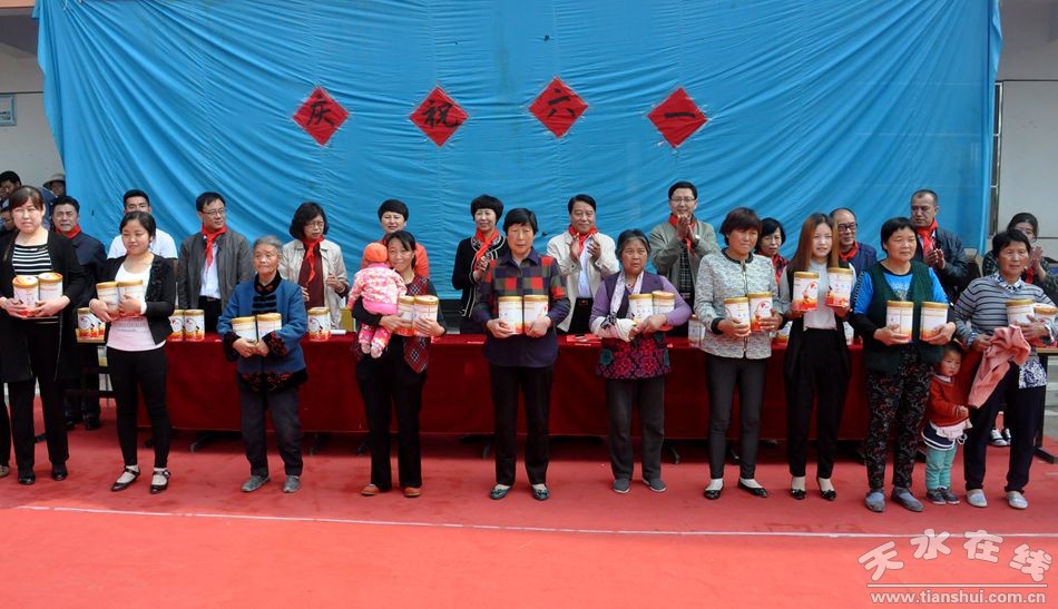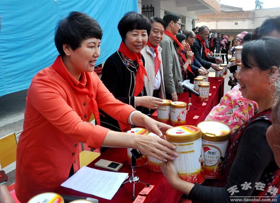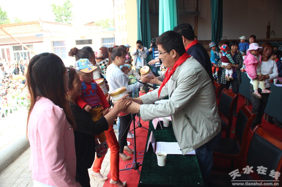 (天水市政协副主席刘永年在甘谷县武家河镇学区开展慰问活动,为武家河村0-3岁儿童发放奶粉。)