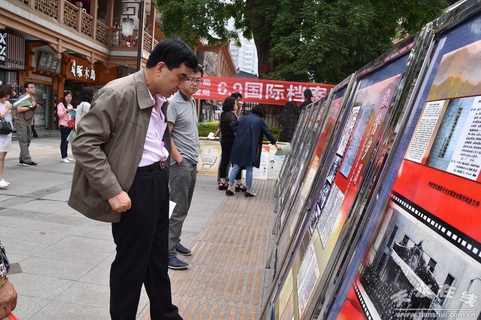 这次展览共分“古档窥踪——天水档案的历史追溯”、“片纸足珍——天水馆藏清代档案”、“劫后遗编——天水民国档案大观”、“激情岁月——解放前后的天水档案”、“变革时代——天水八十年代以来的重要档案”、“时光切片——斑斓多彩的馆藏资料”、“情系兰台——天水档案人的历史责任”等7个部分,展示了全市各综合档案馆藏珍品档案图片300余幅,较好地呈现了天水300多年来、特别是近代以来发生的重大事件、重要活动和历史变迁,展现了天水人民在党的领导下励精图治、开拓创新、拼搏进取的精神风貌。工作人员还向过往群众讲解如何查阅利用档案、宣传档案利用的惠民实例,发放《中国的世界记忆遗产》宣传折页1000余份、“档案与民生”宣传海报100余张,使群众了解了关于档案的基本知识,进一步增强群众保护档案的意识,扩大档案工作社会影响力。共有2000多名各界群众参观了展览。