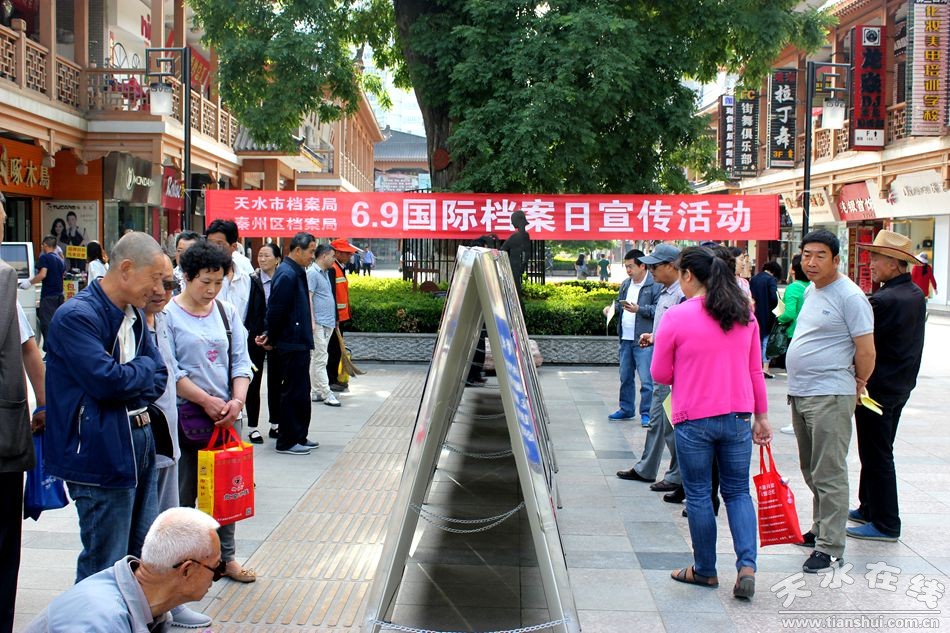 6月6日上午,天水市档案局、秦州区档案局在秦州区中华西路步行街举办了以“档案与民生”为主题的“6·9国际档案日”大型宣传活动。通过举办“天水市馆藏档案资源展”和档案业务咨询宣传等活动,积极构建档案与公众交流的桥梁,增强社会档案意识和公民的档案法制观念,拓展档案社会服务功能,使档案工作更加贴近社会、贴近民生、贴近群众。