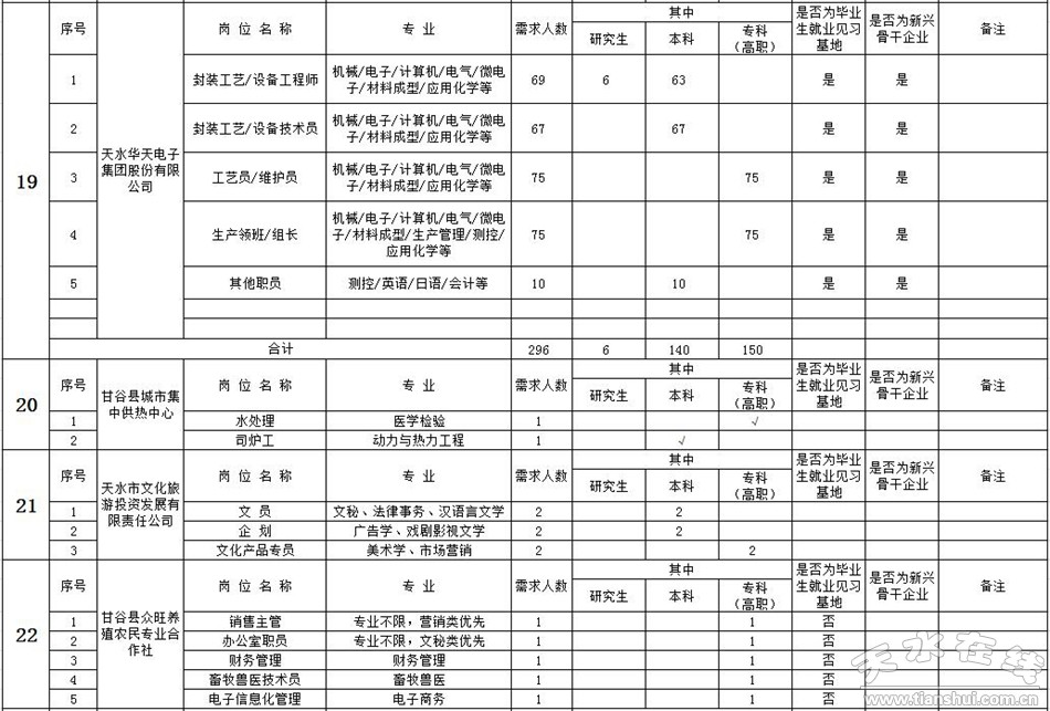 8月24、26日上午9时至下午4时,在天水市人力资源市场二、三楼大厅(天水市秦州区七里墩天河广场西侧),分两场举办双向选择招聘洽谈会,企业序号第1号至61号在8月24 日招聘,企业序号从第62号至132号在8月26 日招聘 。公建民营村级幼儿园的招聘时间另行通知。