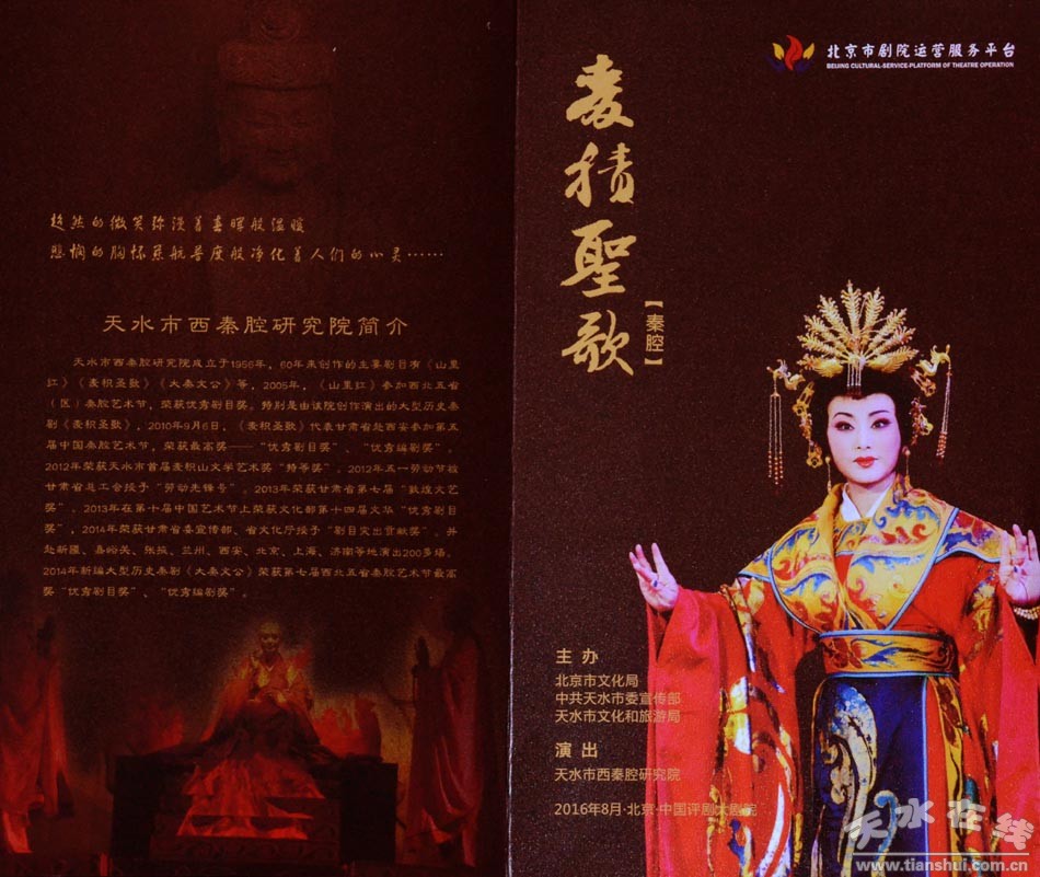 据悉,本次演出是由北京市文化局主办的“2016年度北京市剧院运营服务平台”项目,自5月10日至8月31日之间,以中国评剧大剧院、北京青年剧院、解放军歌剧院三个剧院为主,为北京广大市民带来具有弘扬中国优秀传统文化、弘扬社会主义核心价值观,具有较高艺术水准的舞台艺术作品。2016年计划200台剧目,北京院团及演出机构演出剧目占总剧目的80%,其他省市院团及演出机构演出剧目占总演出剧目的20%,天水市西秦腔研究院精品保留剧《麦积圣歌》有幸入围演出安排。