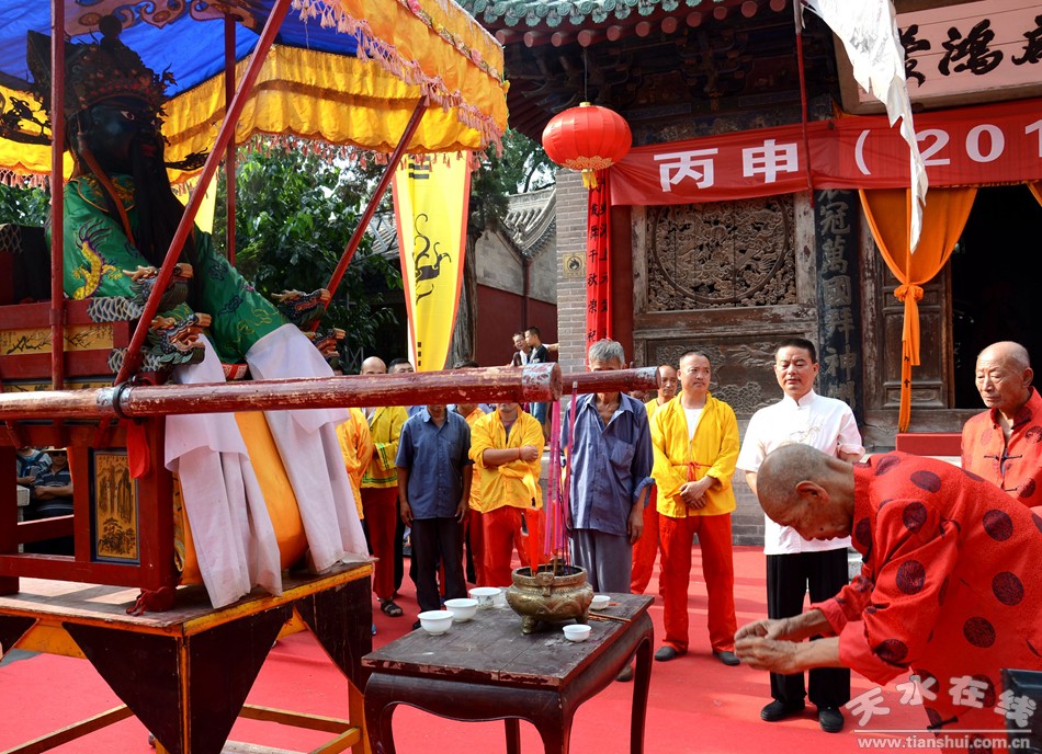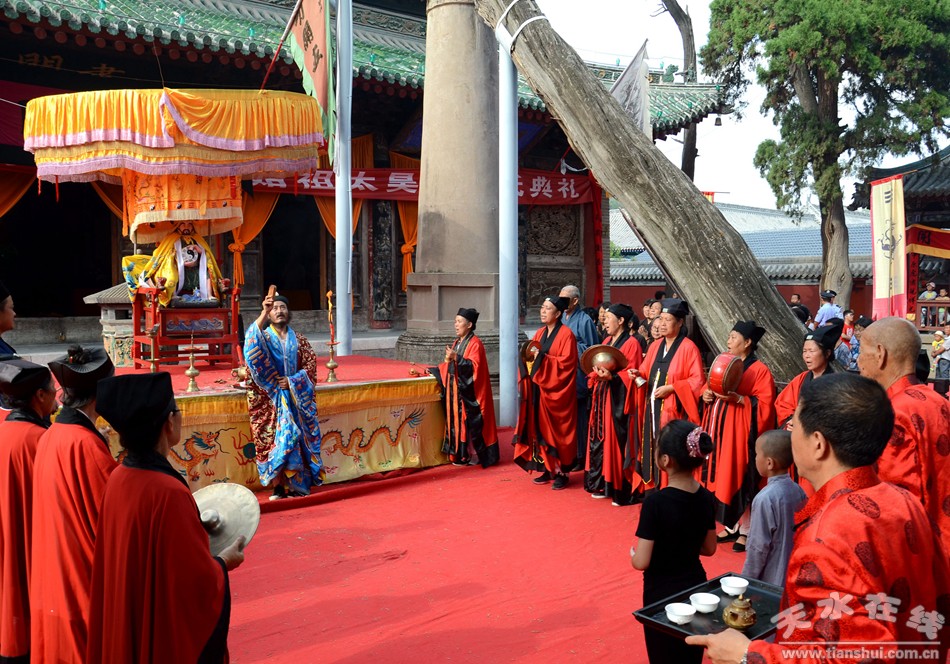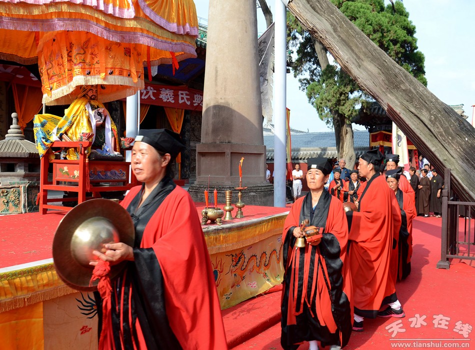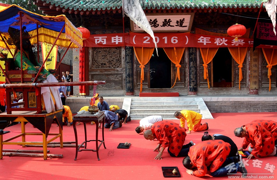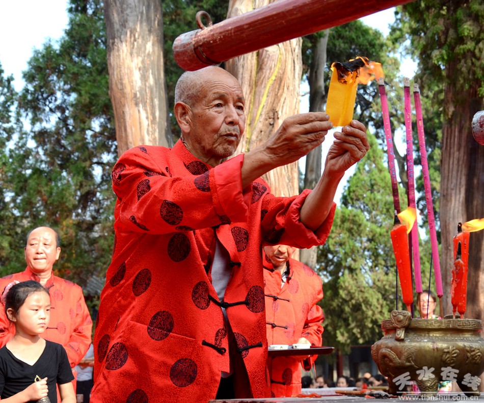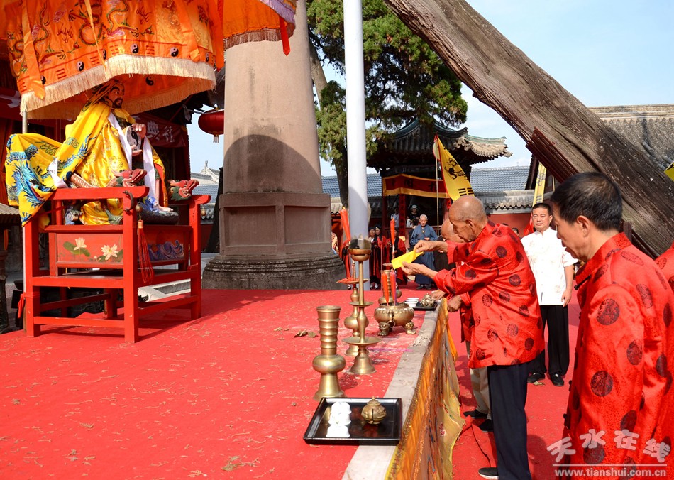 8月22日下午,天水伏羲庙举行丙申(2016)年秋祭中华民族人文始祖太昊伏羲氏典礼之送神、送圣水、焚烧榜文仪式。主要议程有:请方神黑爷至伏羲庙先天殿月台,明烛、上香、化表、献茶;在伏羲庙外方神庙前举行送圣水、焚烧榜文仪式,恭送伏羲神位仙升。