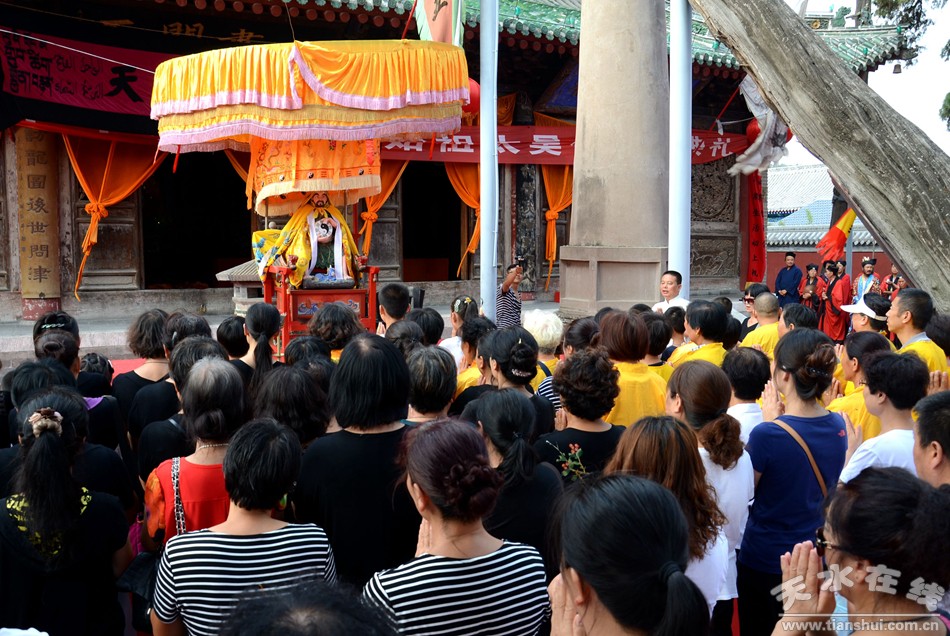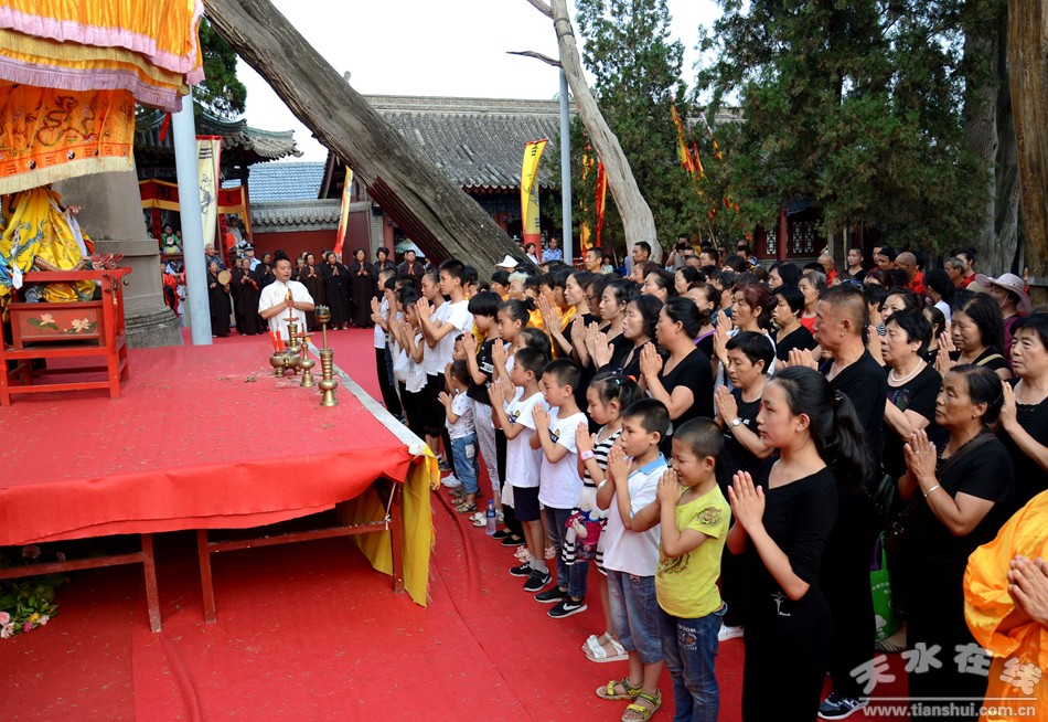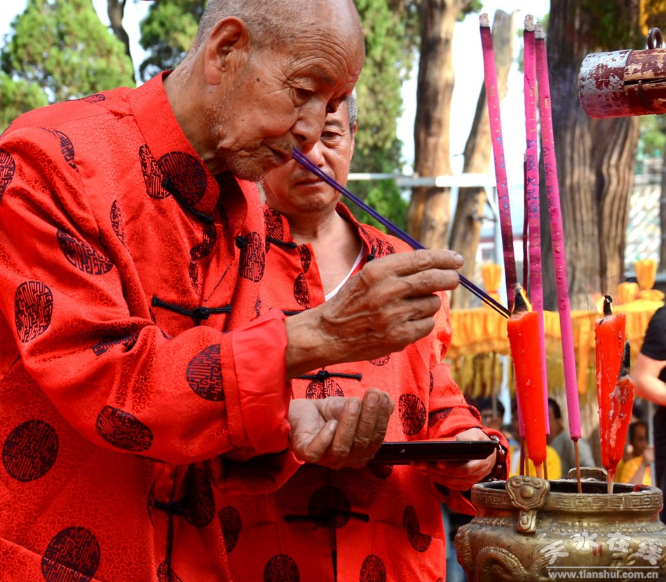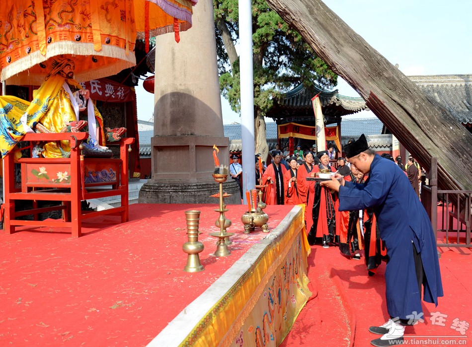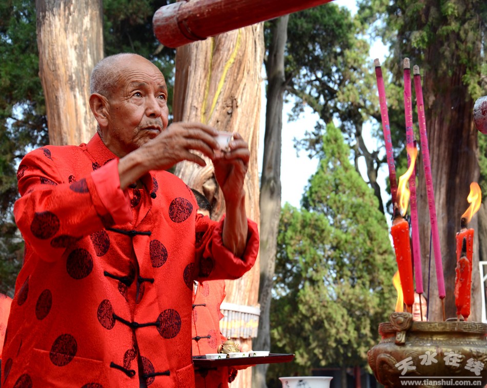 8月22日下午,天水伏羲庙举行丙申(2016)年秋祭中华民族人文始祖太昊伏羲氏典礼之送神、送圣水、焚烧榜文仪式。主要议程有:请方神黑爷至伏羲庙先天殿月台,明烛、上香、化表、献茶;在伏羲庙外方神庙前举行送圣水、焚烧榜文仪式,恭送伏羲神位仙升。