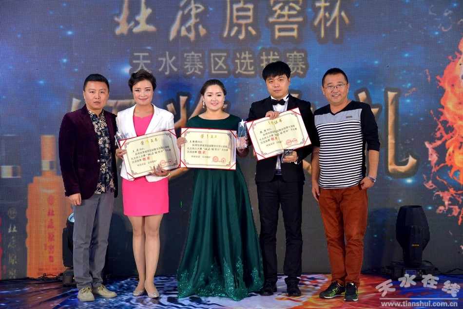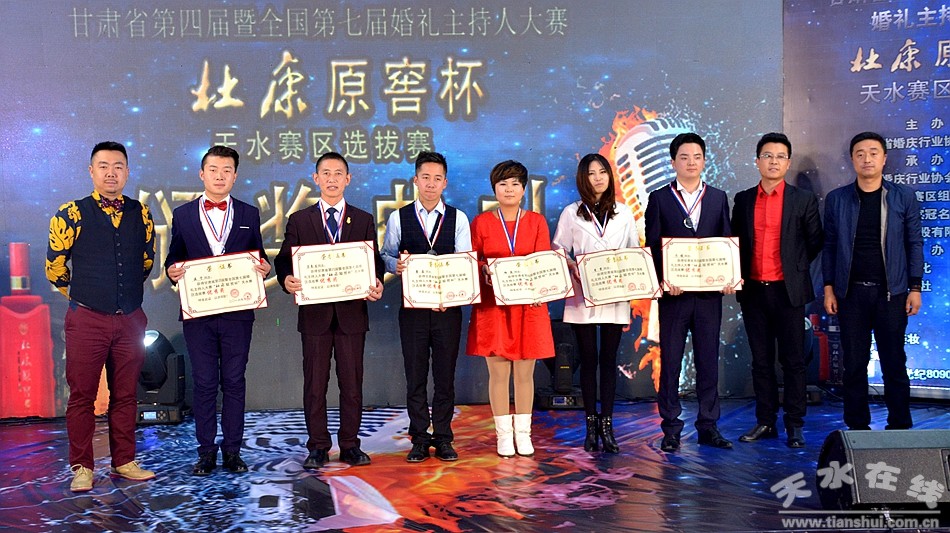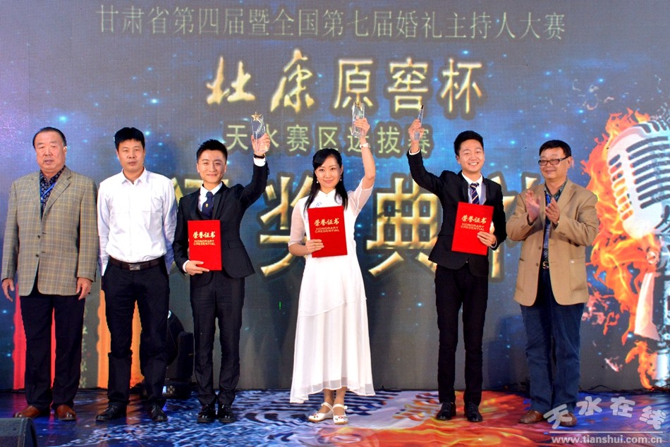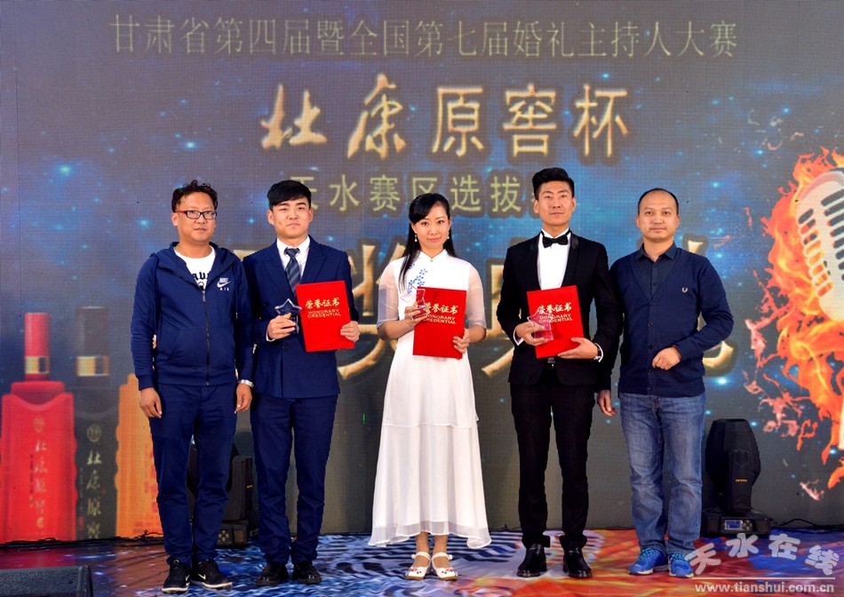 最后经过评委们的综合评审,4号选手张君豪、5号选手赵静和7号选手王敏荣获金奖,1号选手王婷、10号选手王静雅和12号选手张强荣获银奖,上述六位选手将代表天水分赛区参加将于11月间举行的第七届全国婚礼主持人大赛(甘肃赛区)总决赛。铜奖则由11号选手张文辉、13号选手张栋和15号选手胡小妹摘得,其他选手获得甘肃省第四届暨全国第七届婚礼主持人大赛“杜康原窖杯”天水分赛区选拔赛优秀主持人称号。