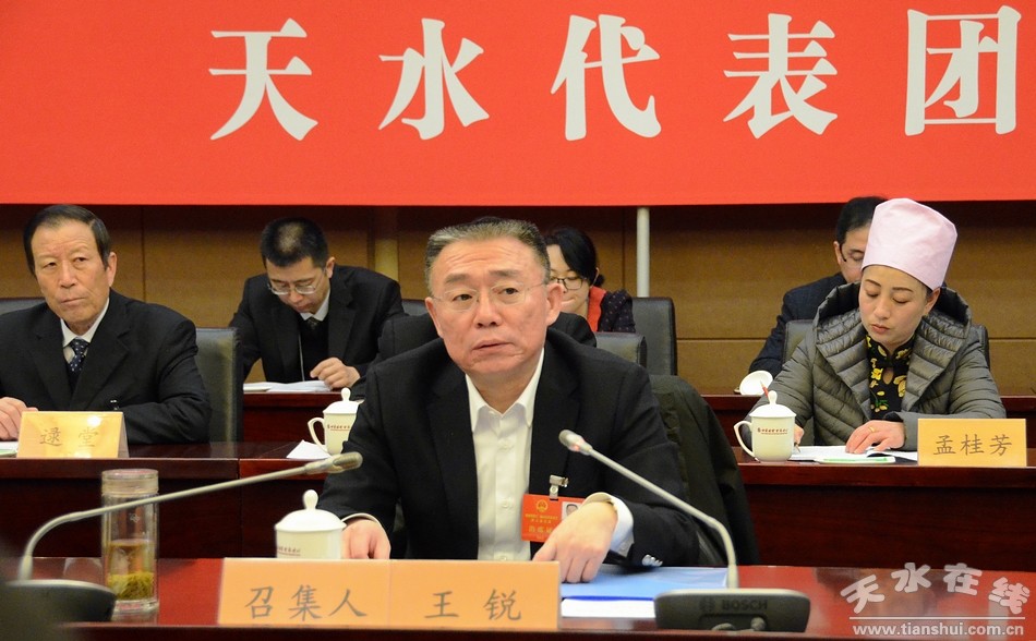 王锐在会上讲话。他强调,省十二届人大六次会议,是全面总结2016年工作、安排部署2017年任务的一次重要会议,议程多、任务重,对于凝心聚力促进转型升级发展、决战决胜全面建成小康社会意义重大。天水代表团各位代表要提高思想认识,讲政治、识大体、顾大局,切实强化代表意识、责任意识、使命意识,认真履行法定职责,正确行使民主权利,以高度负责的态度完成好大会确定的各项任务;要认真审议各项报告,在会议期间紧扣协调推进“五位一体”总体布局和“四个全面”战略布局,紧扣贯彻五大发展新理念和推进供给侧结构性改革,紧扣群众关心关注的热点难点问题尤其是坚决打赢脱贫攻坚战,把握新常态下转型升级面临的新形势,抓住影响全省经济社会发展的关键点,积极踊跃发言,提出真知灼见;要精心撰写建议议案,重点围绕推进丝绸之路经济带黄金段建设、实施创新驱动发展战略、加快文化旅游深度融合发展、培育打造新增长点、构建生态安全屏障、保障改善民生、加强和创新社会治理等方面,提出一些有针对性的高质量建议和议案;要严格遵守大会纪律,按时按点、聚精会神参加会议的各项活动,严格落实中央八项规定和省委“双十条”规定,注重仪容仪表,举止大方得体,以良好的精神状态展示天水代表团的整体形象。
