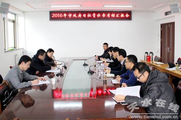 1月12日,天水市政府第一考核组对市环保局2016年度市政府目标管理责任书完成情况进行了考核。 张永刚局长对2016年考核项目完成情况进行了汇报 。局属各单位主要负责人及局机关各科室负责人参加了汇报会。