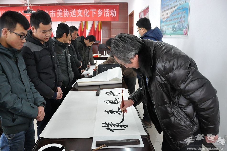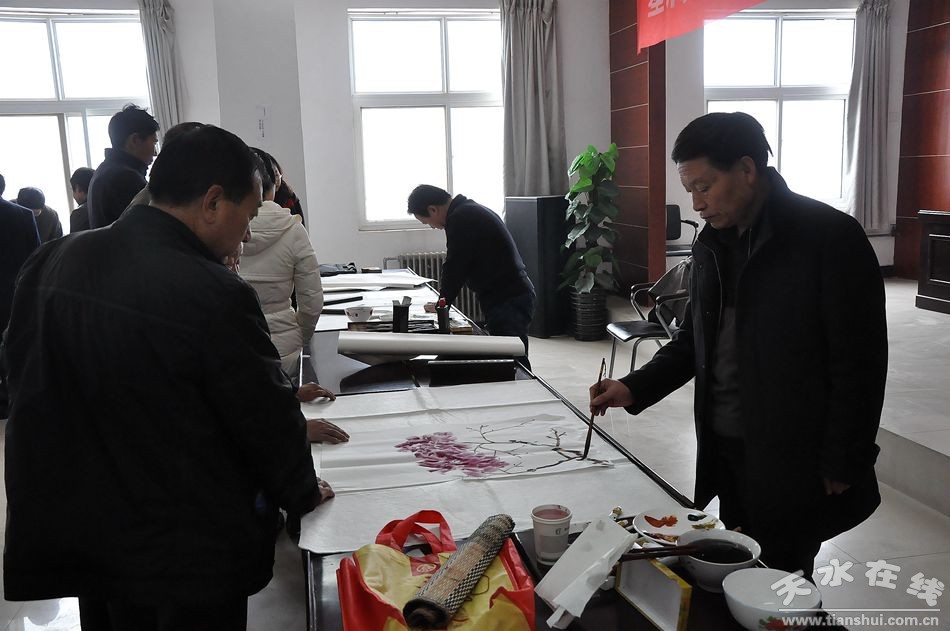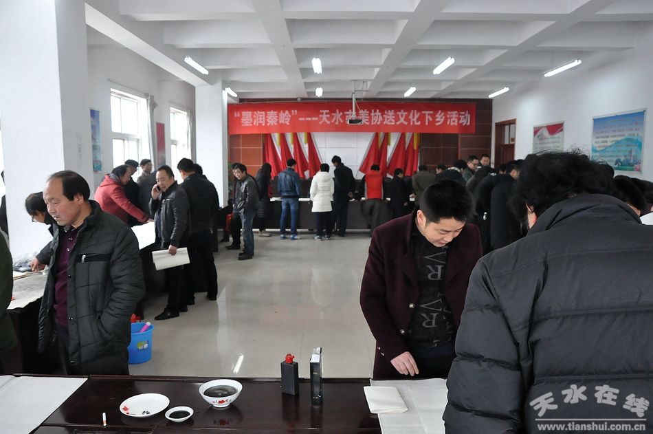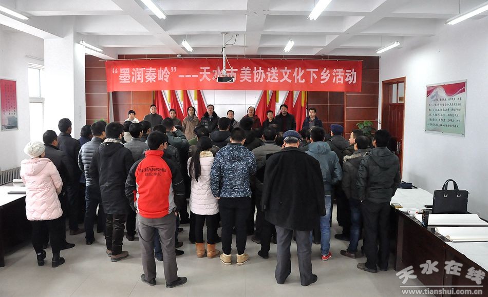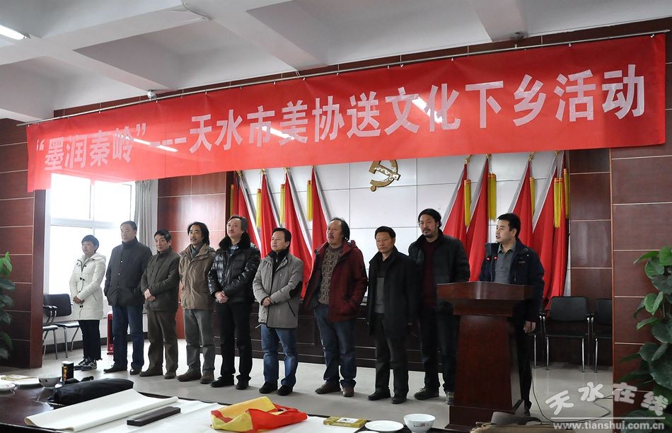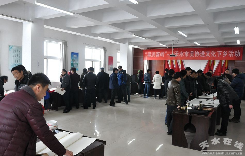 1月18日,在新春来临之际,天水市美术家协会主席贾利珠、副主席靳永红等8位市美协成员,走进秦州区秦岭乡开展“墨润秦岭”文化下乡活动。书画家们现场挥毫泼墨,创作了一百余幅精美的书画作品,为秦岭乡的乡亲们送去了一场载满新春祝福的书画盛宴。