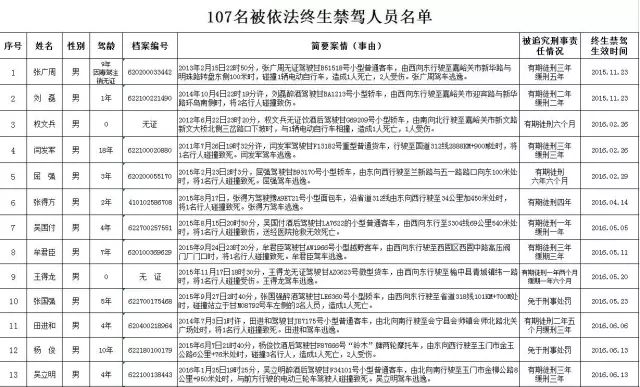 为了教育驾驶人自觉遵守交通法律法规,坚决抵制酒驾交通违法行为,严厉打击交通肇事逃逸犯罪,省公安厅决定对2015年11月至2016年11月期间,因饮酒或者醉酒后驾驶机动车发生重大交通事故、发生交通事故后逃逸等构成犯罪被依法终生禁驾的107名驾驶人予以曝光。