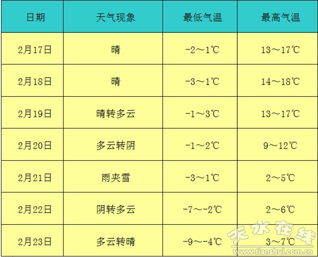 预计17——19日我市天气晴或多云,20日多云转阴,20日夜间到21日上午有雨夹雪,22日阴转多云,23日多云转晴。其中20日开始受冷空气影响我市平均气温将下降4——5℃,20日当天我市有4——5级阵风。