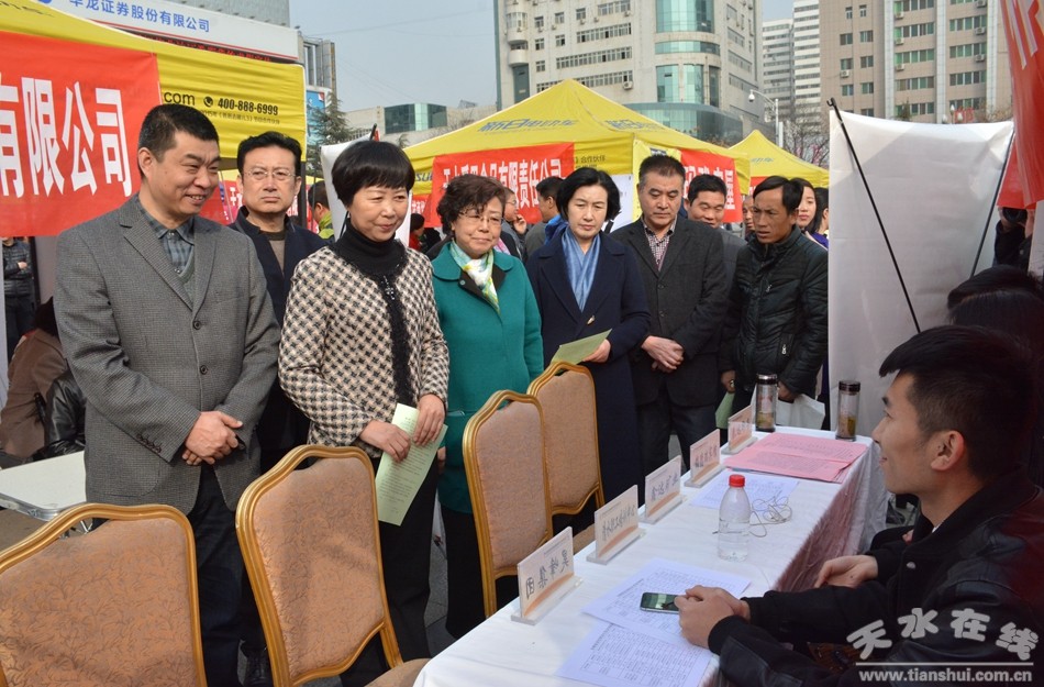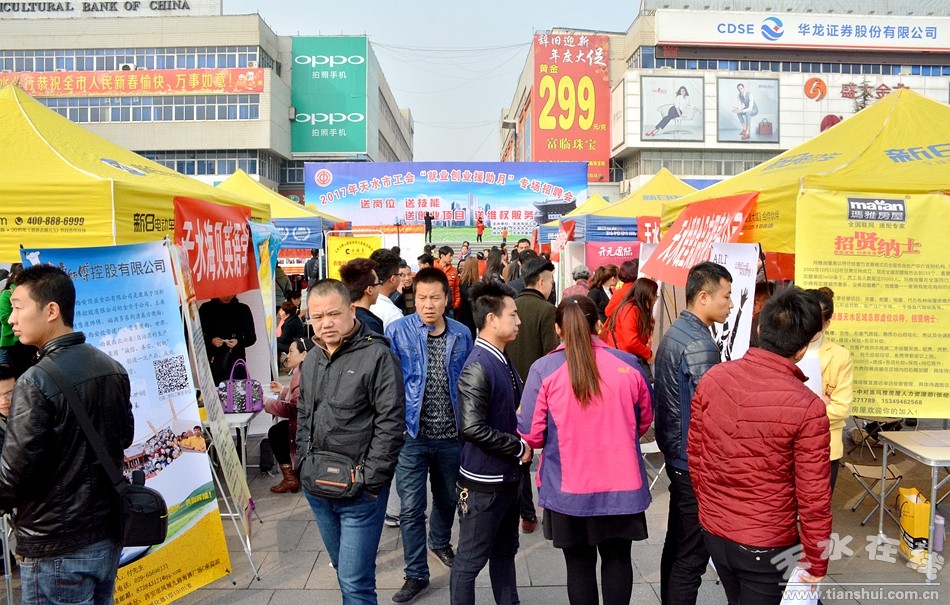 2月18日上午,天水市2017年工会就业援助月专场招聘会在秦州区龙城广场启动。本次招聘会由天水市总工会主办,天水市总工会就业服务中心承办,为期三天,将先后在秦州和麦积举行。招聘会共组织企业100多家,主要面向社会未就业的下岗职工和农民工、农村劳动力转移人员、青年、高校毕业生等群体提供就业岗位。在当天的招聘会上,现场参加应聘人员3000多人次,意向签订就业合同1000多人次。