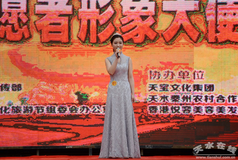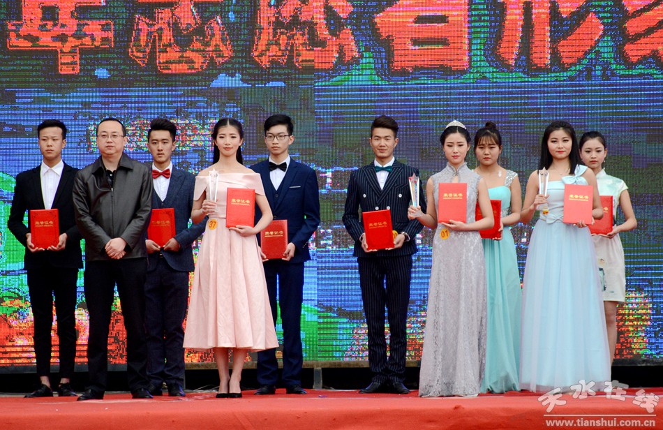 (天水市委宣传部副部长赵子洲、市文明办主任张秀丽为荣获大赛形象大使称号选手颁奖)