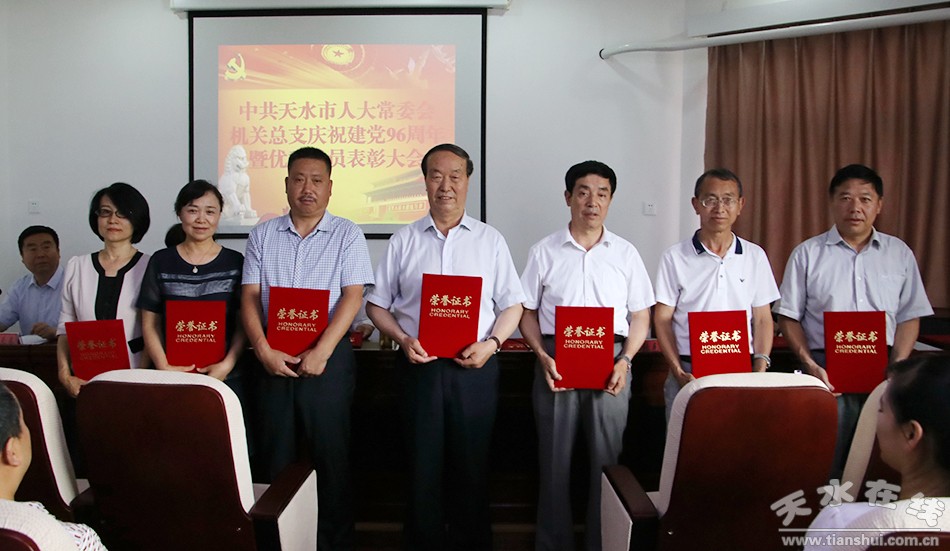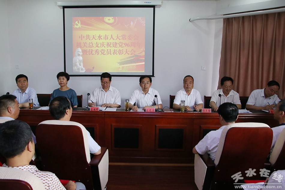 6月29日,天水市人大常委会召开机关庆祝建党96周年暨优秀共产党员表彰大会。市人大常委会党组书记、主任王光庆,市人大常委会副主任张克强、蒲朝晖、宋建平、王晓琴,市人大常委会秘书长杨坤出席会议。