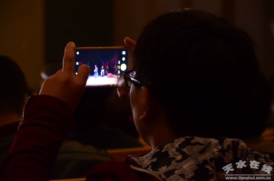 当晚演出场外,西安市民晒票、围观海报,忙的不亦乐乎。剧场内,年长观众沉醉于秦腔的表演方式,矛盾冲突不断的剧情则引起年轻观众的传播兴趣,他们不时拿出手机拍摄视频,对秦腔历史剧同步网络分享。
