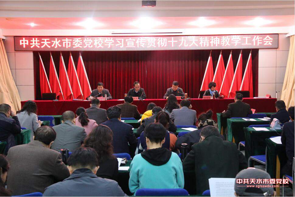 中国共产党第十九次全国代表大会开幕以来,中共天水市委党校把学习宣传贯彻党的十九大精神作为首要政治任务,掀起了学习热潮。10月24日上午,市委党校常务副校长温钦虎主持召开学习宣传贯彻党的十九大精神教学工作会议,学习习近平总书记在党的十九大开幕式上所作的报告,学习研读十九大报告的新思想、新论断、新提法和新举措,并就党的十九大精神“进课堂、进教材、进头脑,进机关、进社区、进农村”做出了全面部署和安排。市委党校县级干部以及全体专业技术人员共80多人参加了会议。