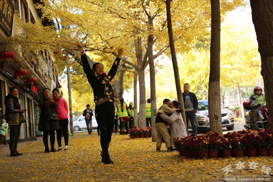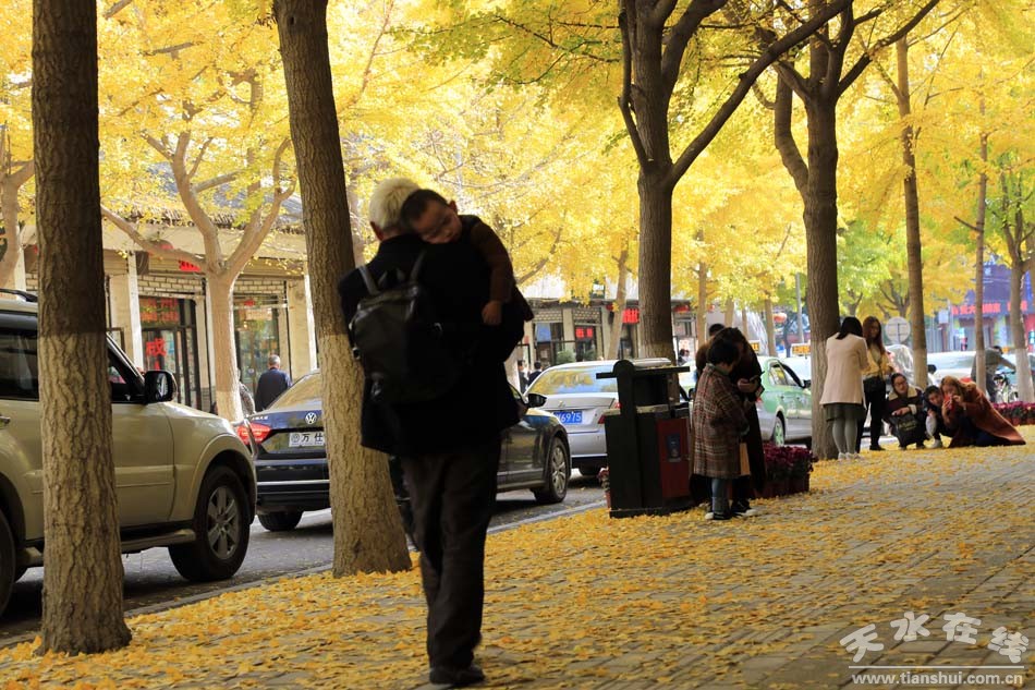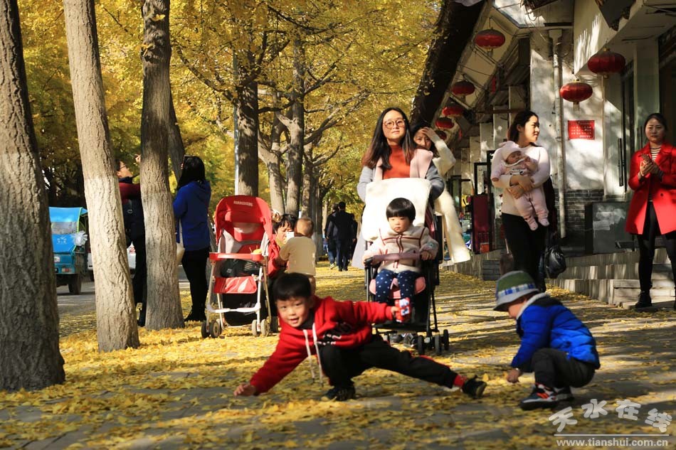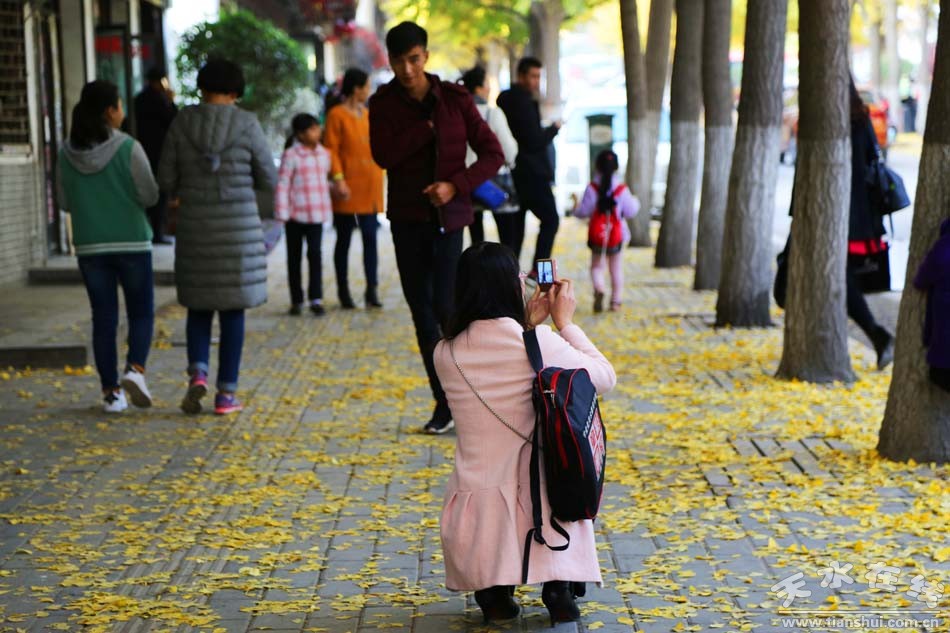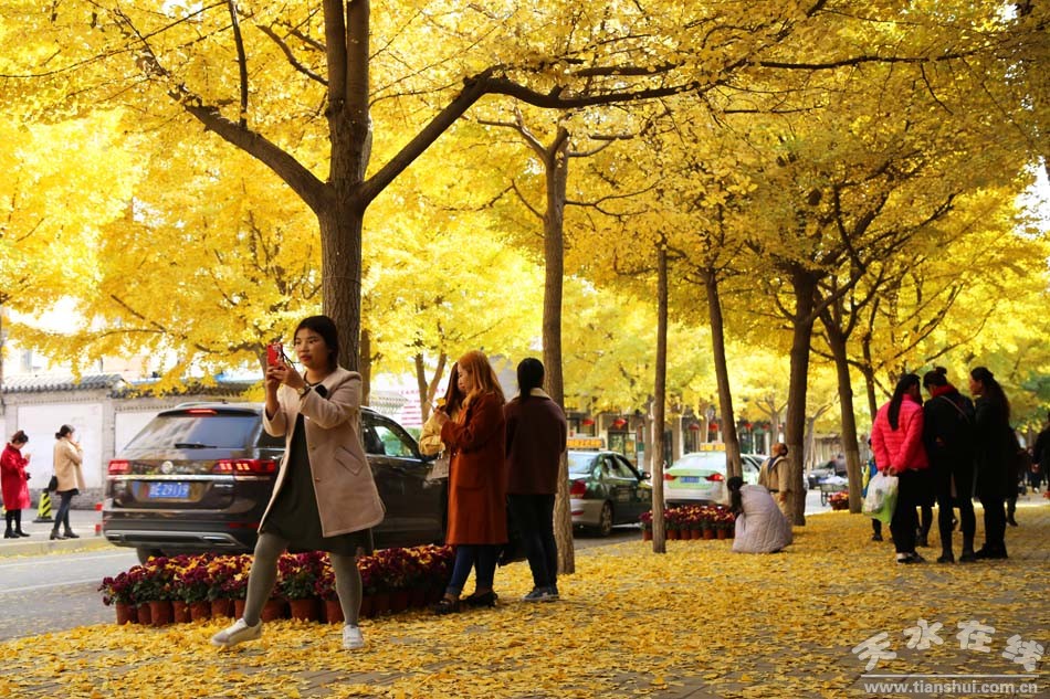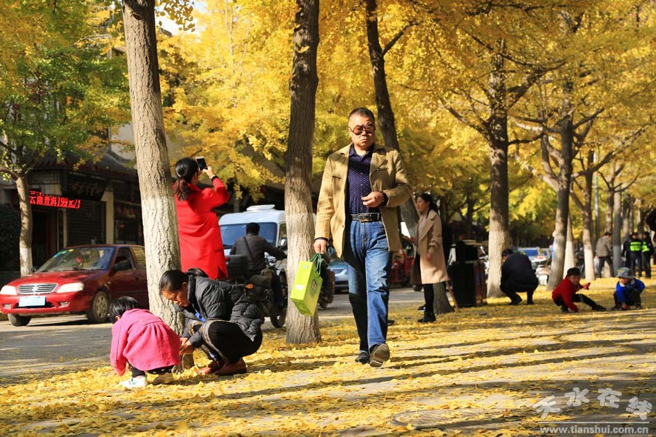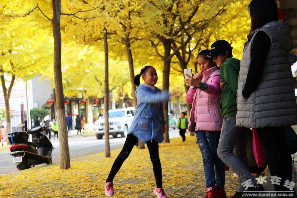 天水在线11月5日报道 深秋时节,天水市秦州区青年南北路的银杏叶子已经全部金黄,进入一年中最美的时节。11月5日的青年南北路,落叶遍地,景美如画。时值周日,市民纷纷来到这里,或驻足欣赏,或嬉戏玩乐,或摄影,或摄像,或自拍,真是美了美了,醉了醉了。
