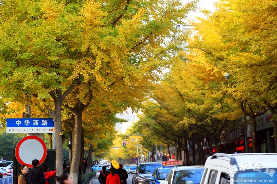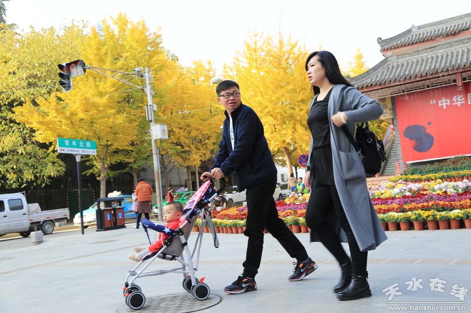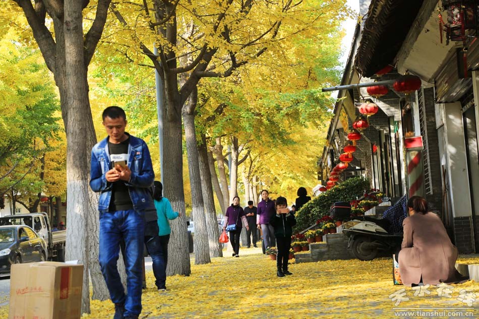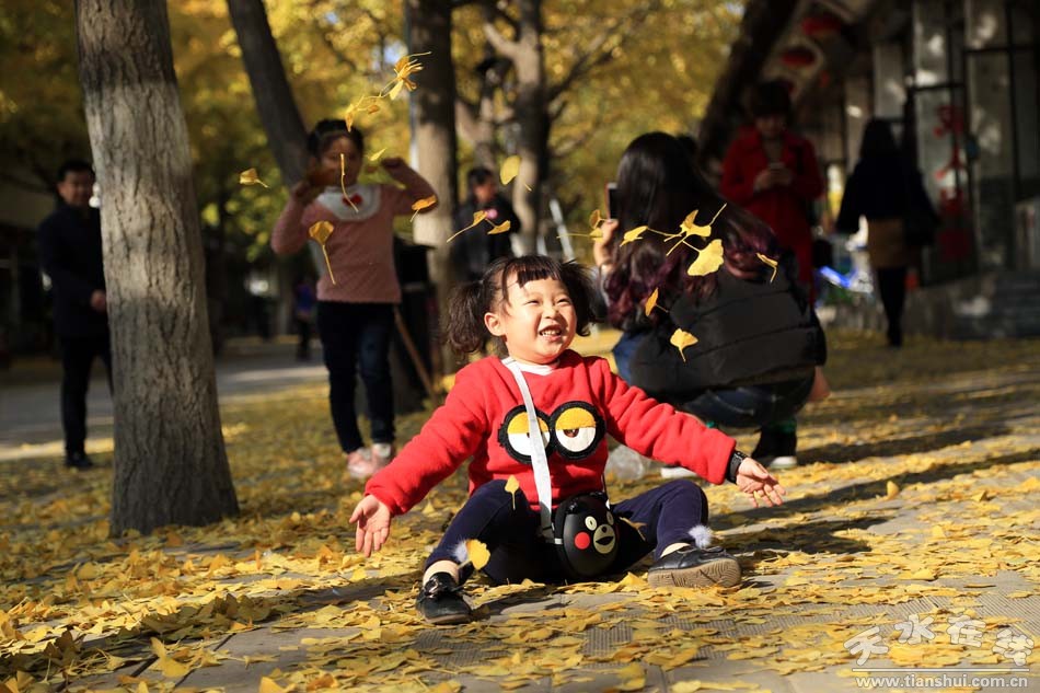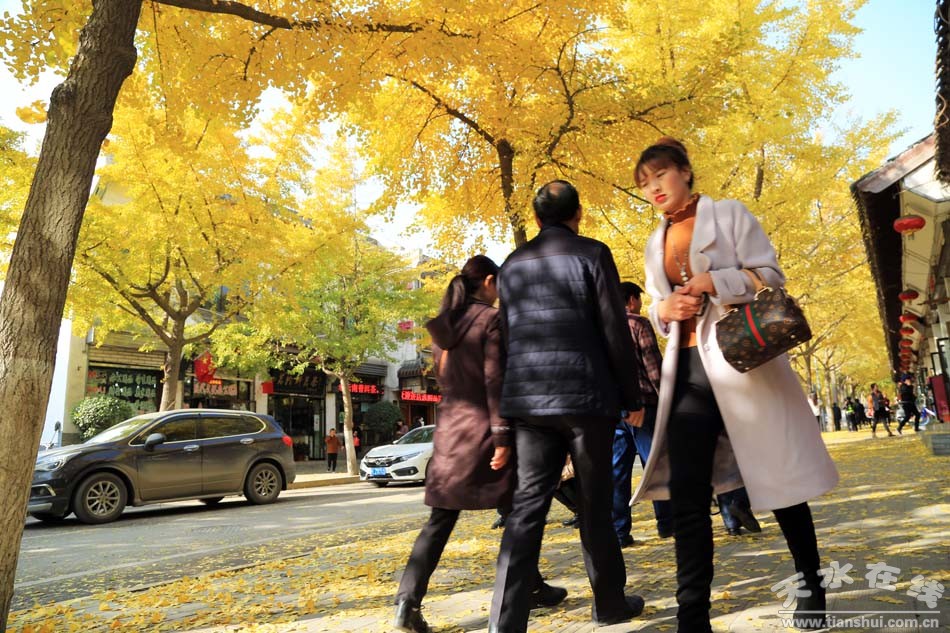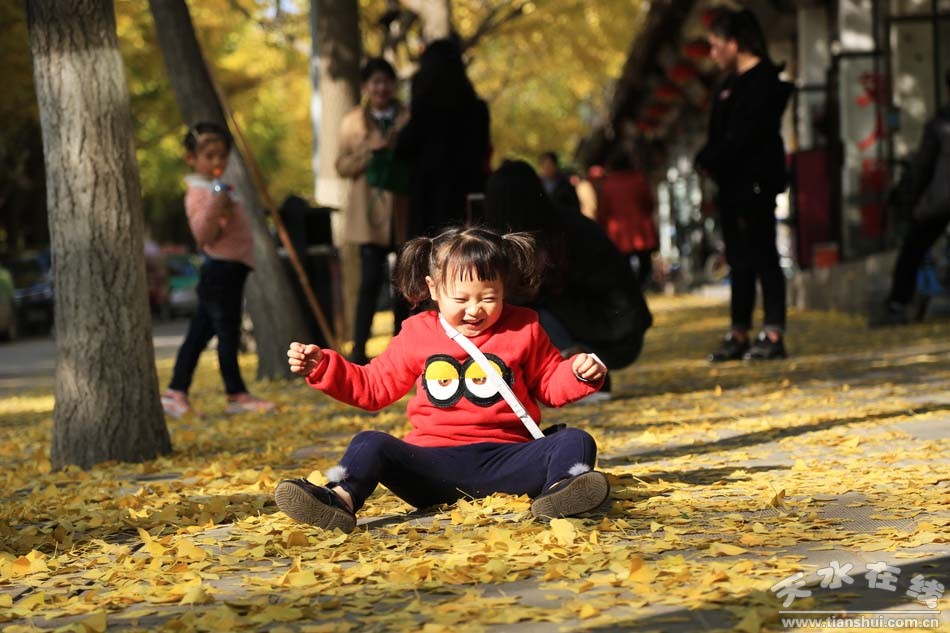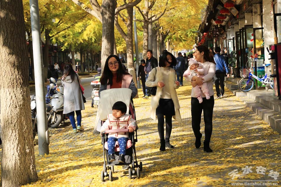 天水在线11月5日报道 深秋时节,天水市秦州区青年南北路的银杏叶子已经全部金黄,进入一年中最美的时节。11月5日的青年南北路,落叶遍地,景美如画。时值周日,市民纷纷来到这里,或驻足欣赏,或嬉戏玩乐,或摄影,或摄像,或自拍,真是美了美了,醉了醉了。