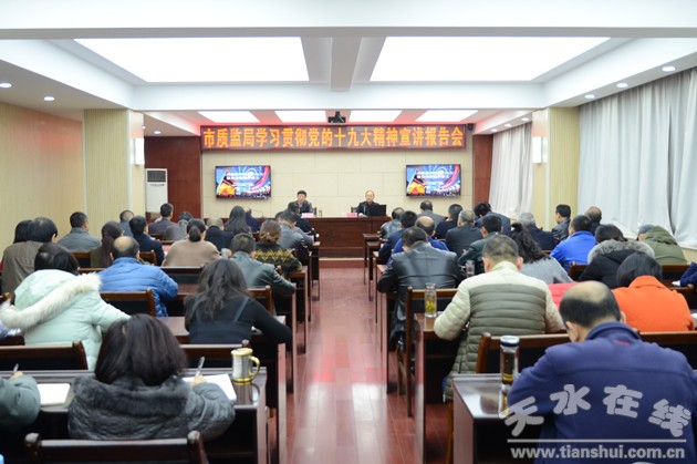 11月20日,天水市质监局组织开展学习贯彻党的十九大精神宣讲活动。市委讲师团成员、市委研究室副主任吴和平同志作了题为《深刻理解和把握十九大报告的精髓和要义》的宣讲报告。市局党组成员、调研员、副调研员,局机关全体和各直属事业单位领导班子成员、党员代表,共计60余人参加报告会。