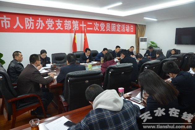 12月14日下午,市人防办党支部组织全体党员开展了第十二次“党员固定活动日”活动,党支部书记蔡向增主持。会上,办党组成员、副主任王建平同志以《深入学习领会十九大精神,在新时代奋力开创人民防空事业新局面》为题作了党课辅导,全体党员更加深刻地领会了“新时代”的含义;随机抽点了7名同志就学习党的十九大精神进行了交流发言,从多角度交流了十九大精神的学习心得,为更加全面的学习领会十九大精神提供了学习借鉴;对《公务员法》中公务员的义务与权利、考核、奖励与惩戒等章节进行了重点学习;蔡向增同志对加强单位作风纪律建设提出了明确要求;现场缴纳了十二月份党费。