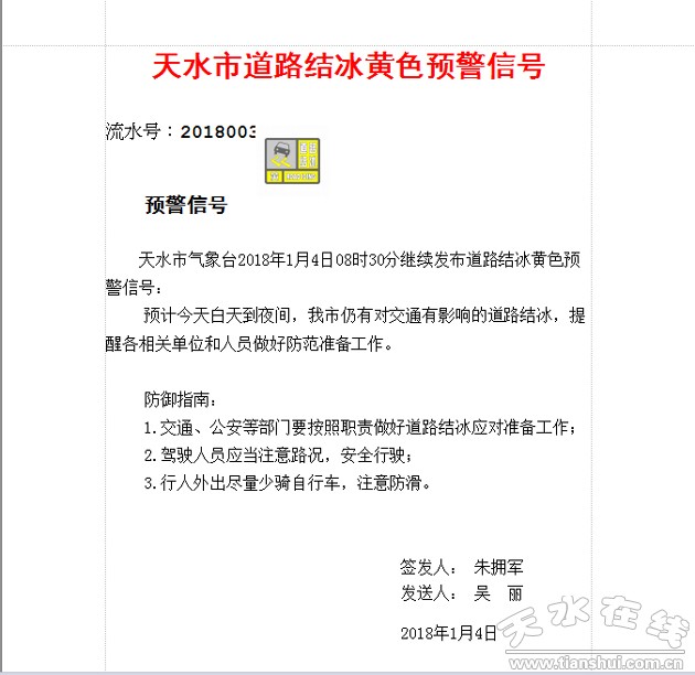 ·天水市气象台持续发布道路结冰黄色预警信号