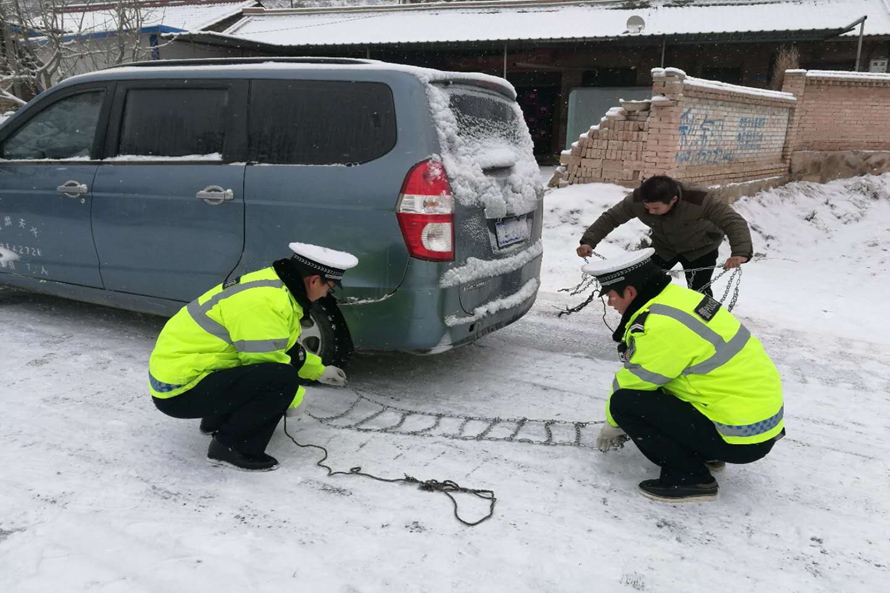 秦安县公安局交警大队各中队民警根据道路状况,加大对辖区路面的巡逻力度,并对过往车辆一一安装防滑链,提示驾驶员冰雪天气下注意减速慢行,保持安全车距。