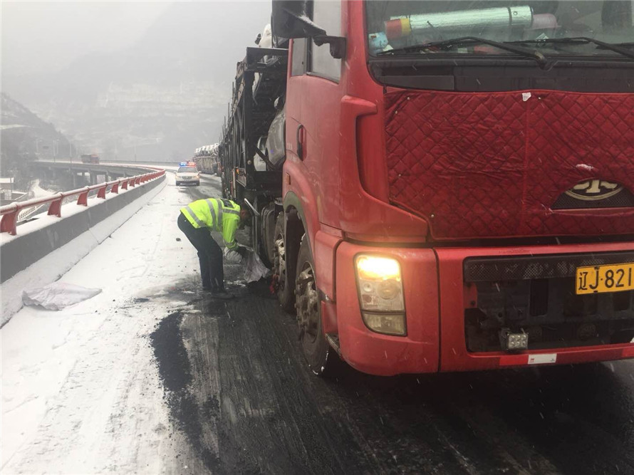 甘泉高速大队接到省路警联合指挥中心指令后,对全线路段进行临时交通管制,同时联系高速公路养护部门加快撒盐除冰工作;大队领导带头上路,全员到岗不间断开展路面巡逻工作,对李子坪、白杨岭、东岔河特大桥上滞留的车辆进行疏导,逐车帮助驾驶员安装防滑链,确保其安全通行。
