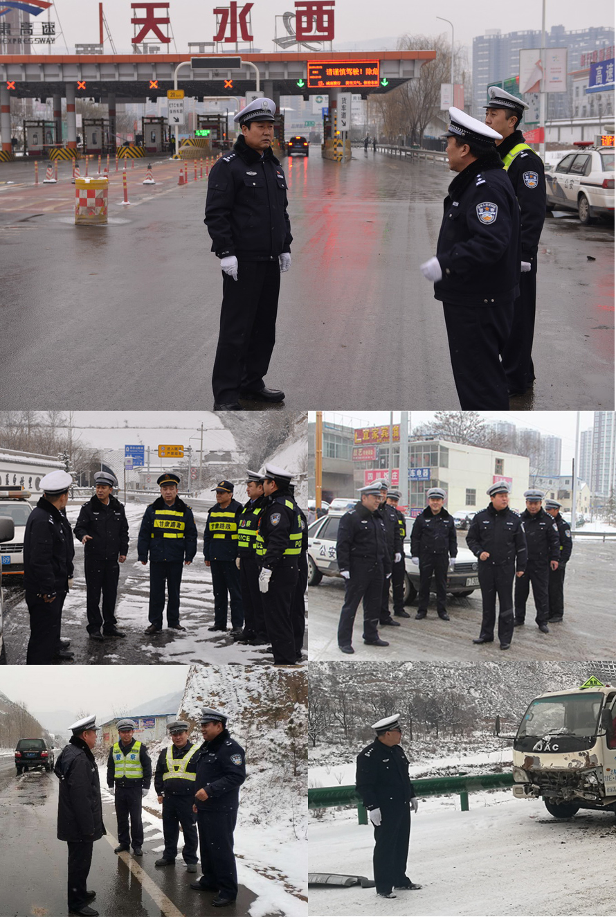 机动大队领导分别带队,在石马坪、迎宾桥、七里墩、地校等路段进行巡逻管控,清理路面占道停放、违法停放车辆,协助打滑、抛锚车辆驶离行车道;采取延时下班巡逻、网络媒体和919天水交广台播报路面情况等方式,提醒、劝导过往车辆安全通行;联合路政养护等相关部门,采取撒盐、撒土的方式清理路面积雪。