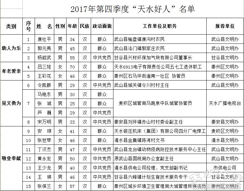 2017年第四季度“天水好人”名单日前出炉,他们有助人为乐好人康社平、郭元亮、杨能武,孝老爱亲好人吕三娃、王彩花,见义勇为好人令凯群、马艳东、张斌、芦巍、宋万明,敬业奉献好人安琪、张世琴、丁汉杰、黄永宏、王少龙、王瑛、张保兰。