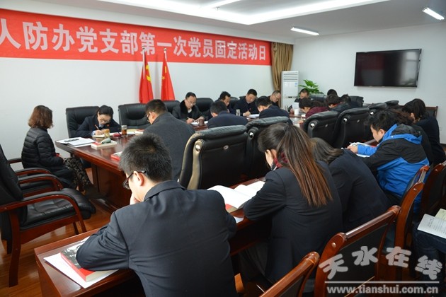 1月12日下午,天水市人防办党支部组织全体党员开展了第一次“党员固定活动日”活动,党支部书记蔡向增主持。会上,大家重点学习了《党章》第五、六、七章内容和党的十九大报告中“八个明确”主要内容、“十四个坚持”基本方略,并传达了习近平总书记在学习贯彻党的十九大精神研讨班开班式上的重要讲话精神;蔡向增同志传达学习了中组部关于2017年度组织生活会和民主评议党员要注意的几个问题,同时结合办党支部实际情况,就召开好2017年度党支部组织生活会作了先期安排部署,提出目标要求和注意事项。