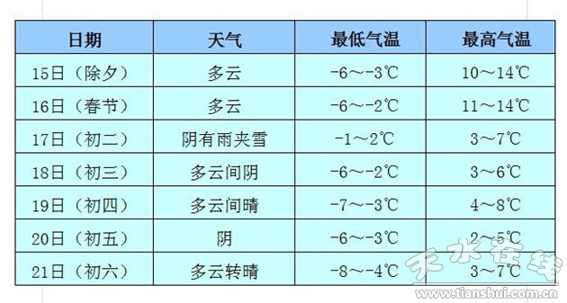 【摘要】预计春节期间我市天气以多云为主,气象条件基本有利于走亲访友和外出旅游。17日受弱冷空气和高原暖湿气流影响我市阴有雨夹雪,其中秦州区、麦积区小雨,其余县区雨夹雪,高海拔山区有降雪。节假前期(15——16日)气温较高,17日之后受冷空气影响气温较前期有所下降。需防范降水天气对交通出行的不利影响。