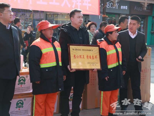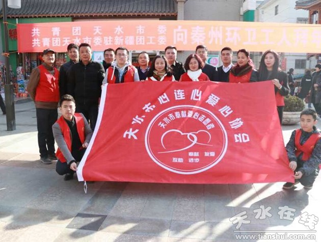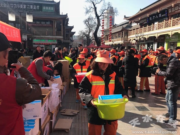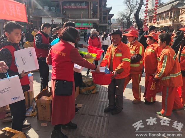 在春节即将来临之际,共青团天水市委、天水驻新疆团工委于2018年2月12日下午在步行街开展向环卫工人拜年活动。团市委、天水驻新疆团工委、团秦州区委、环卫局相关负责人以及天水心连心爱心协会志愿者参加了本次活动。