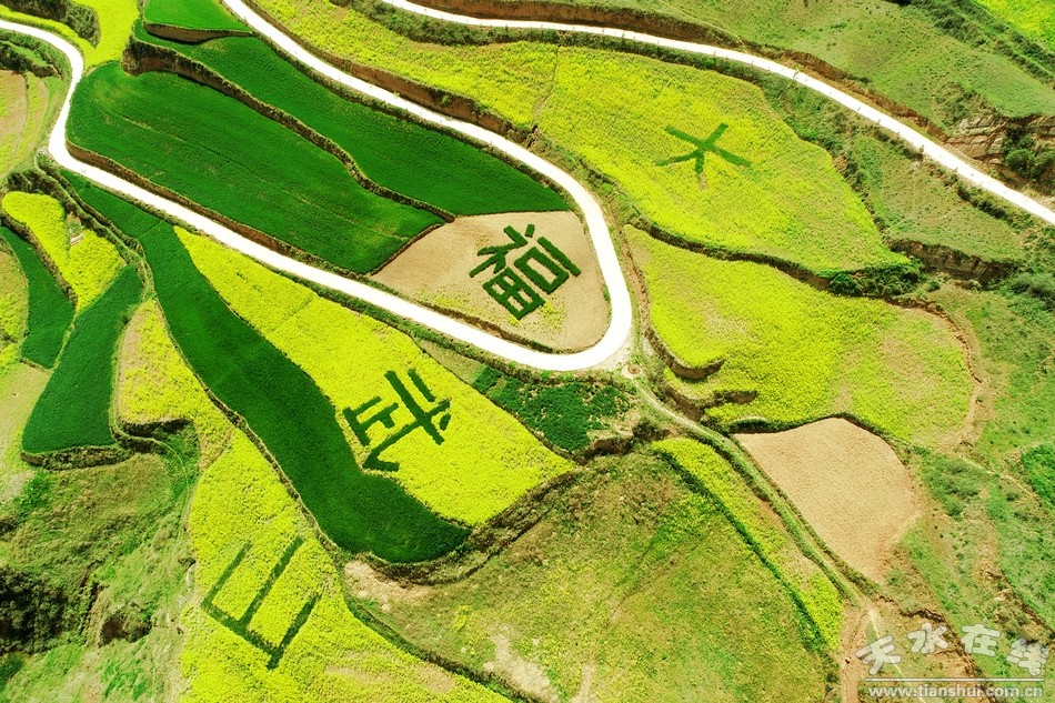每年的五月,是武山县油菜花开的季节。今年,在龙台镇马年村,这里的老百姓更是在开满油菜花的梯田里,用小麦和油菜花种出了一道景观。“大福武山”四个大字,似流动的山涧春水,是那样的美好而富有活力。“大福武山”不再是一道人文景观,而是要在这山里生根,与油菜花一起给这里的父老乡亲带来幸福和希望,更是要给前来游览的游客送上福气,送上祝福。