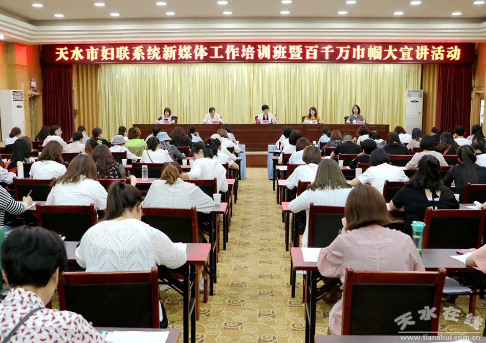 为深入学习贯彻习近平新时代中国特色社会主义思想和党的十九大精神,贯彻落实中央、省、市党的群团工作会议精神,进一步提高全市妇联系统网络宣传引导和新媒体工作能力,更好地传递党的声音,凝聚巾帼力量,树立妇联形象,6月14日,天水市妇联系统举办新媒体工作培训班暨百千万巾帼大宣讲活动。