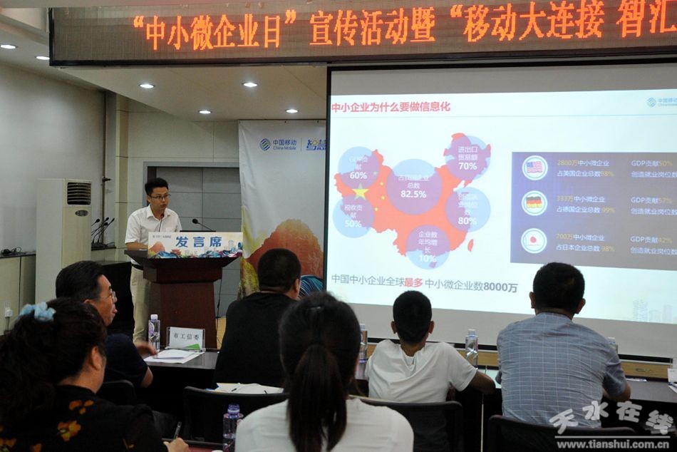 6月27日,在联合国第二个世界“中小微企业日”,天水市工信委联合中国移动天水分公司举办“中小微企业日”宣传活动暨信息化推介示范会。