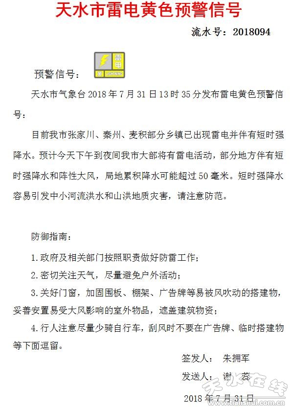 【市抗旱防汛指挥部】据天水市气象台2018年7月31日13时35分发布雷电黄色预警信号:目前我市张家川、秦州、麦积部分乡镇已出现雷电并伴有短时强降水。预计今天下午到夜间我市大部将有雷电活动,部分地方伴有短时强降水和阵性大风,局地累计降水可能超过50毫米。短时强降水容易引发中小河流洪水和山洪地质灾害,请注意防范。市抗旱防汛指挥部已向各县区发出预警通知,要求做好暴雨洪水防范工作。