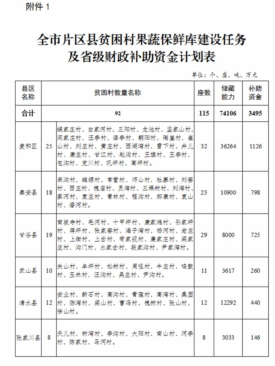 各县区人民政府,市政府有关部门,市属及驻市有关单位: 为深入推进我市贫困村果蔬保鲜库建设,解决果蔬集中收获上市价贱伤农、产后损失严重等产销对接的瓶颈问题,实现反季节销售和周年均衡供给,稳定果蔬价格,延长产业链条,提高市场竞争力,助推产业扶贫,促进农民持续增收、稳定脱贫,根据省政府办公厅《关于扶持全省贫困村果蔬保鲜库发展的意见》(甘政办发〔2018〕121号)精神,现结合全市实际,提出如下实施意见。 一、指导思想 以习近平扶贫开发战略思想为指导,认真落实中央及省市打赢脱贫攻坚战系列决策部署,紧紧围绕果品和蔬菜两大特色产业,立足贫困村资源禀赋和产业优势,通过政策引导和项目支撑,支持有带动能力的贫困村果蔬专业合作社,按照每个有需求的贫困村至少建设1座果蔬保鲜库的要求,在全市贫困村新建果蔬保鲜库,实现全市有一定规模的果品和蔬菜产业贫困村保鲜库全覆盖,提升贫困村果蔬保鲜储藏能力,促进产业扶贫深入开展。 二、主要目标 全市有果蔬保鲜库需求的麦积、武山、甘谷、秦安、清水、张家川6个片区县的92个贫困村,新建果蔬保鲜库115座,新增果蔬保鲜储藏能力74106吨,省级财政补助3495万元(见附件1);甘谷县、张家川县的3个贫困村购置移动保鲜库3个,省级财政每个补助15万元,共计45万元(见附件2)。果蔬保鲜库建设分2年完成,2018年完成70%以上,2019年全面建成。通过果蔬保鲜库和移动保鲜库建设,全面实现贫困村果蔬保鲜库全覆盖。 三、基本原则 (一)坚持精准到村,精准施策推进。有需求的贫困村至少规划建设1个以上果蔬保鲜库,做到建设目标任务精准、政策措施精准、责任考核精准、组织保障精准,确保果蔬保鲜库建设任务按期完成。 (二)坚持加强扶持,多元筹资融资。把贫困村果蔬保鲜库建设作为扶贫攻坚的重要基础设施和关键环节,积极争取落实扶持政策措施,多元化筹措资金。引导、鼓励、支持农业龙头企业、农民专业合作社、供销社等主体投资建设。 (三)坚持突出优势,因地因势利导。立足贫困村产业发展实际,结合自然条件、产业布局、用电、用水、交通和市场等因素,科学测算建设需求,确定建设地点,确保建设规模与产业发展水平相适应,确保项目选址突出区域优势,最大程度实现辐射带动效益。 (四)坚持效益导向,尊重农民意愿。根据贫困村产业发展实际,坚持效益导向,充分尊重农民意愿,不搞一刀切,不搞强迫命令,加强宣传引导,强化示范带动,借助农村“三变”改革,充分激发村集体及农民群众参与果蔬保鲜库建设的积极性和主动性,壮大村级集体经济规模,增加贫困群众收入。 四、主要任务 (一)明确建设内容,保证建设质量。新建果蔬保鲜库的库内净储藏能力,需达到或超过市县申报、省财政补助下达的建设规模。保鲜库3立方米容积折合1吨储藏能力。鼓励移动保鲜库建设主体自主选购移动式冷库或箱式冷藏车。果蔬保鲜库建设材料由业主选择,制冷机组、制冷量、制冷工质、蒸发器、电源、总装机功率等符合相应库容规模的技术参数要求,用电、用水、通行方便,建成后当年投入使用。果蔬保鲜库建设项目,达到申请、立项、设施及农用地备案等手续齐全,符合消防安全要求。严格按照设计要求进行建设,建筑单位要有相应资质,严把建材质量关,保证建设进度和质量。 (二)明确建设主体,靠实建设责任。贫困村果蔬专业合作社是果蔬保鲜库建设的主体。有能力的农民专业合作社可自主建设,没有能力的合作社可与其他合作社联合建设,也可由龙头企业、供销社等市场主体代建或投资建设。 (三)严格扶持标准,明晰产权归属。项目建设资金通过财政支持、建设主体自筹和申请特色产业专项贷款等途径筹措。全面落实好省级财政安排专项扶持资金,对新建果蔬保鲜库100吨补助10.5万元,最高补助37万元。果蔬保鲜库建成后,经县区级农业、财政等相关部门验收合格后落实省级补助资金,由财政补助资金形成的资产,要结合农村“三变”改革,平均量化到村集体及贫困户。 落实好贫困村农民专业合作社购置的移动式冷库或箱式冷藏车省财政每辆补助15万元的扶持政策,对财政补助资金形成的资产也要平均量化到村集体贫困户。贫困村合作社移动式冷库或箱式冷藏车,也可租赁给有关物流公司经营,租赁方式和分红比例由各县区指导有关乡镇、贫困村根据实际情况确定。移动式冷库或箱式冷藏车可采取招标形式,选定2─3家生产企业统一采购,具体办法由各县区自行确定。 五、保障措施 (一)加强组织领导,精心组织实施。市脱贫攻坚产业开发专责工作组要充分发挥职能作用,指导各县区落实好贫困村果蔬保鲜库建设任务。要把果蔬保鲜库建设纳入产业扶贫工作考核体系,加强组织领导,完善工作机制,强化协作配合,做到领导责任到位、政策措施到位、服务保障到位,及时发现和解决问题,形成工作合力。要强化资金监管,提高财政资金使用效益。要充分调动龙头企业、农民专业合作社及供销社的积极性,制定项目建设和运营方案,落实工作责任,精心组织实施,确保任务落到实处。 (二)落实扶持政策,推进项目实施。省级扶持资金采取一次性安排、切块到县的方式下达。各县区政府要整合相关项目资金,加大对保鲜库建设的支持力度。要充分利用省、市、县各级投融资平台,特别是甘肃金控天水融资担
