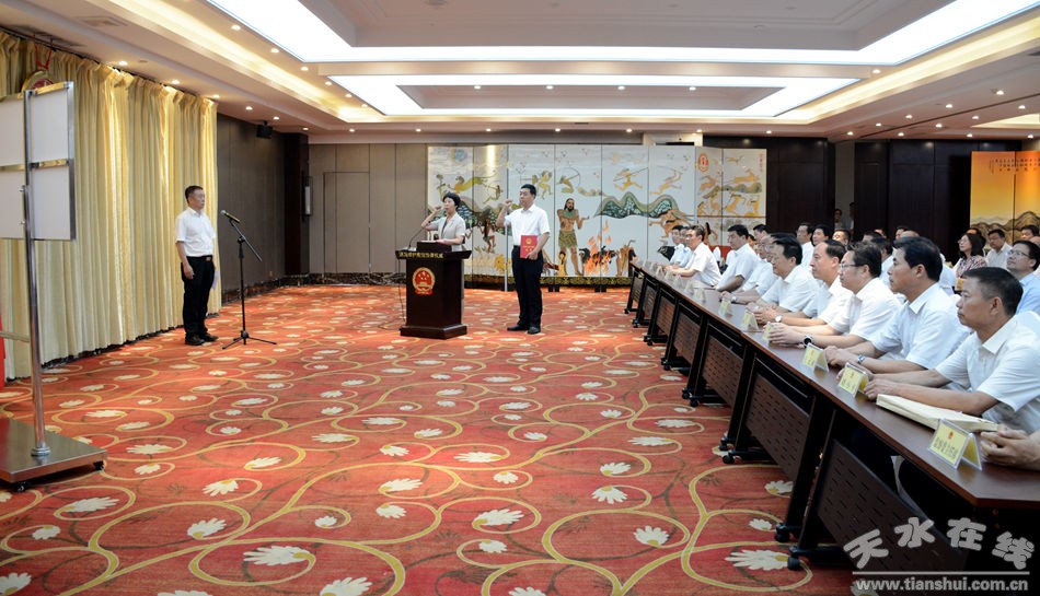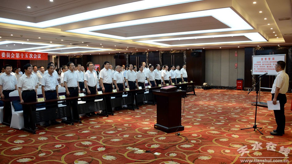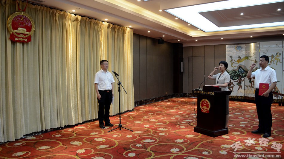 宣誓会场国徽高悬、气氛庄严,五星红旗鲜艳夺目,宣誓台上摆放着《中华人民共和国宪法》。宣誓仪式开始,奏唱中华人民共和国国歌,领誓人、市人大常委会副主任王晓琴带领宣誓人市政府副市长逯克宗向宪法进行庄严宣誓。