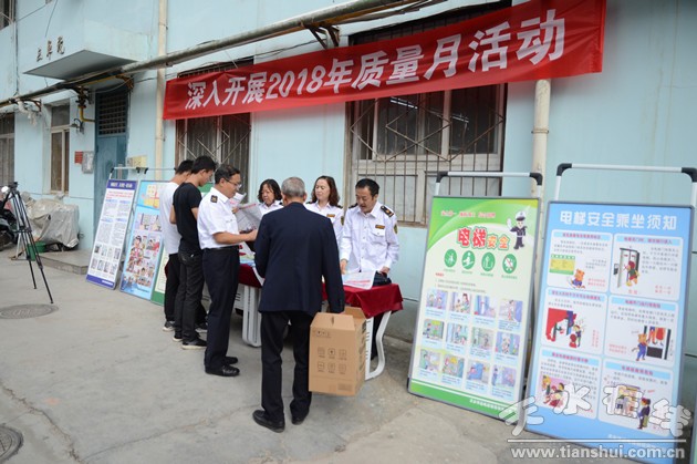 ——特种设备安全进社区。特种设备安全关乎你我他,天水市特种设备检验所积极转变服务方式,在“兰天新华苑”小区开展特种设备安全宣传咨询活动。通过设置咨询台、悬挂宣传横幅、放置安全知识展板等多种方式,广泛宣传与百姓生活息息相关的电梯、液化石油气钢瓶和天然气安全常识,详细讲解紧急救援方法,并与群众积极互动解答疑问。通过宣传,增强住户种设备安全意识,保障特种设备安全运行。