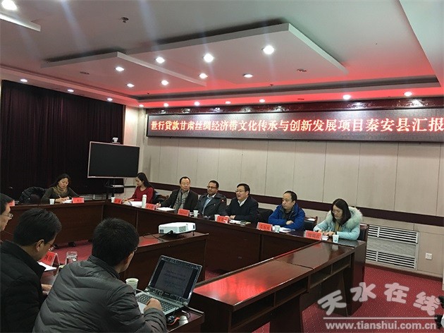 世行专家团队成员和省市项目办听取秦安县委书记王东红就项目准备情况及有关问题的汇报。会上对世行法规、环评、社评、文评等相关事宜进行了充分交流和说明。会议基本确定,秦安县大地湾—陇城古镇—上关明清古街文化旅游景区建设项目入选世行贷款甘肃丝绸之路经济文化传承与创新发展项目。