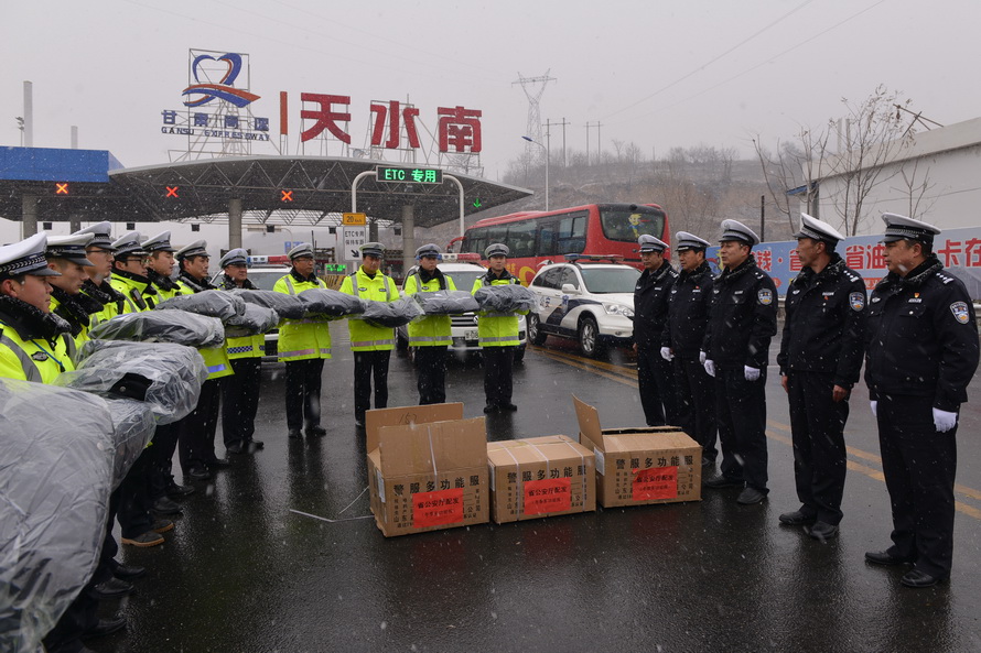 (省公安厅交管局“百日行动”督导组雪天“送温暖” 给执勤民警送去多功能服)