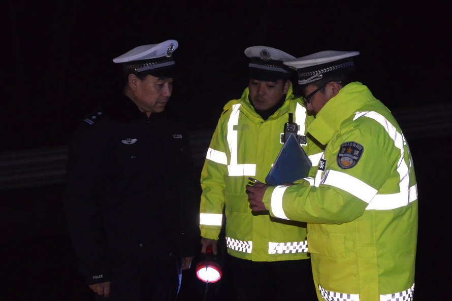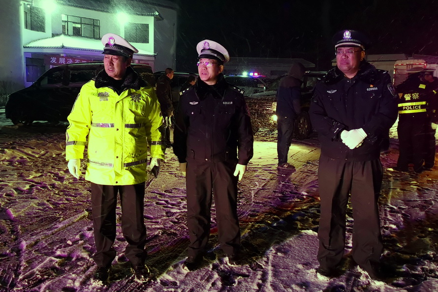 (市公安局党委委员、交警支队支队长柳润泰雪天检查道路交通安保情况)
