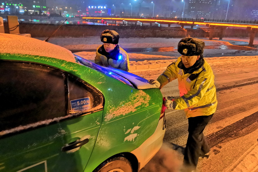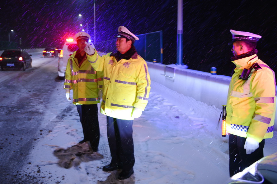 (市公安局交警支队副支队长何永东雪天检查道路交通安保情况)