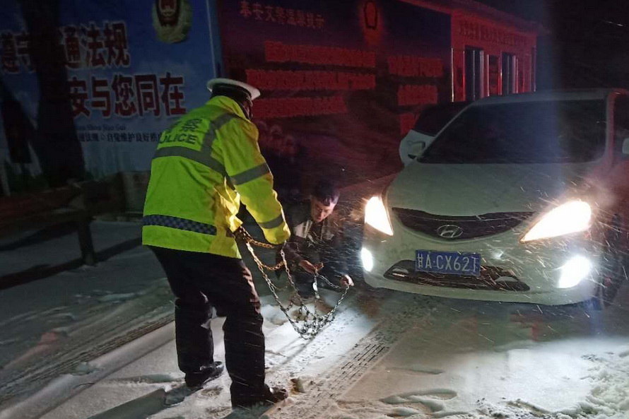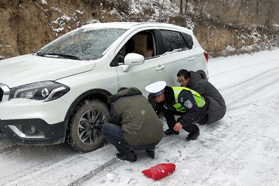 (在王甫梁为车辆安装防滑链)