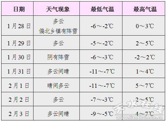 【摘要】未来一周,我市天气以多云为主,基本有利于“春运”。其中,30日受北方冷空气影响,我市将出现降温降雪天气。日最高气温下降2~3℃,日最低气温下降4~5℃。降温降雪天气有利于改善空气质量、降低森林火险气象等级,但对春运期间民众出行和交通运输有不利影响。